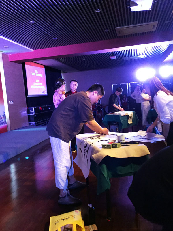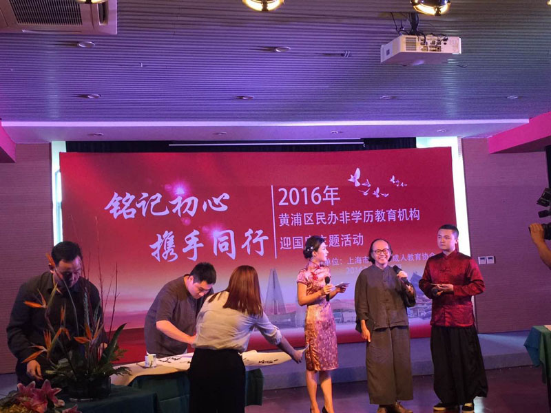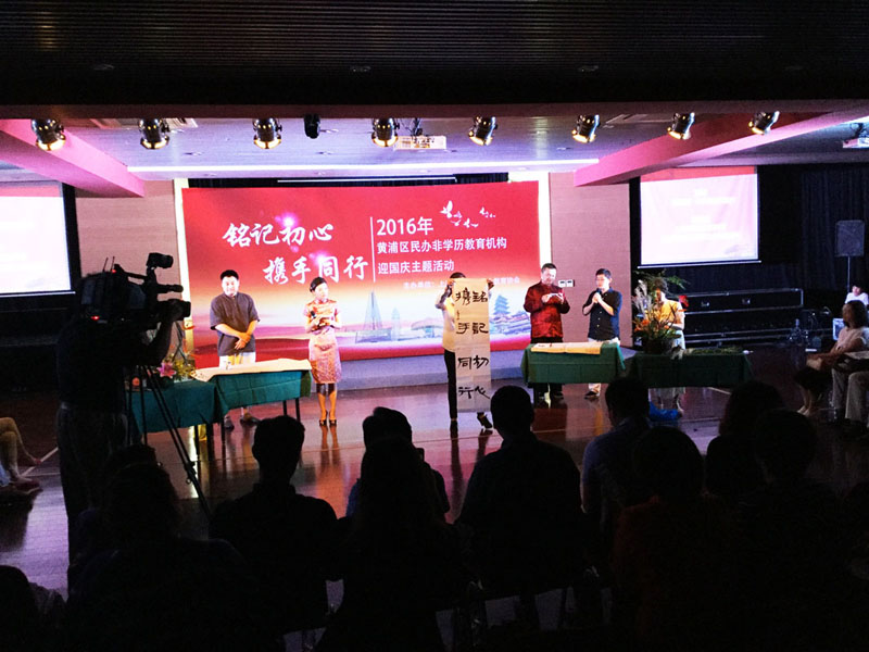 2016929日上午,黄浦区“铭记初心,携手同行——黄浦区举行民办非学历教育工作会议和迎国庆联谊”活动。会上,大无限艺术学校吴叶舟和朱茂一两位教师当场挥毫为大家呈上了两件书法作品。