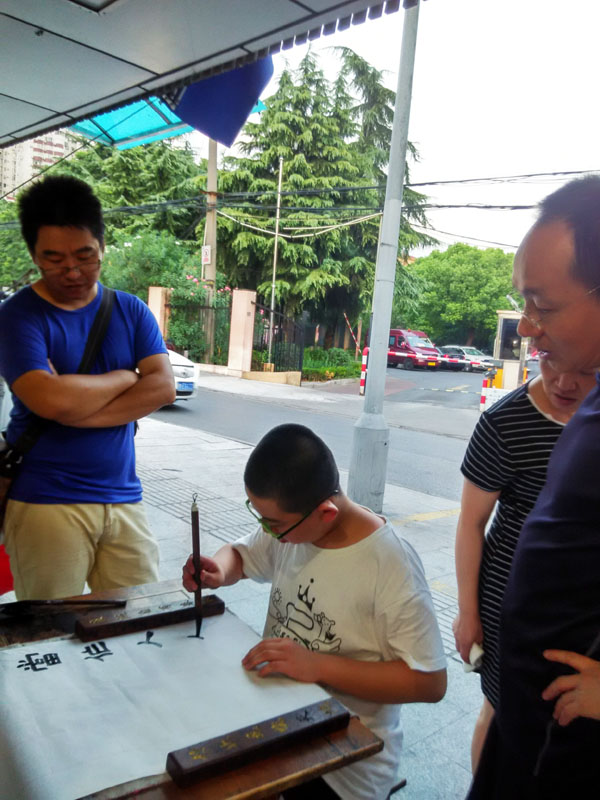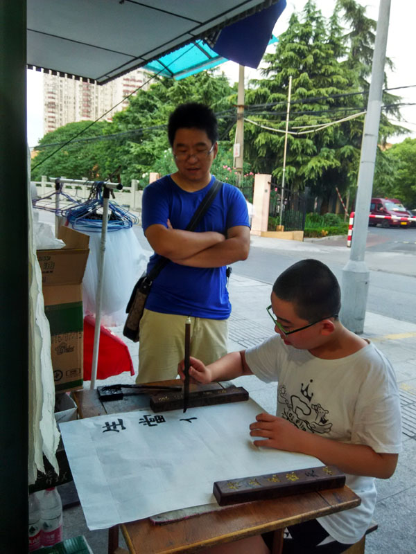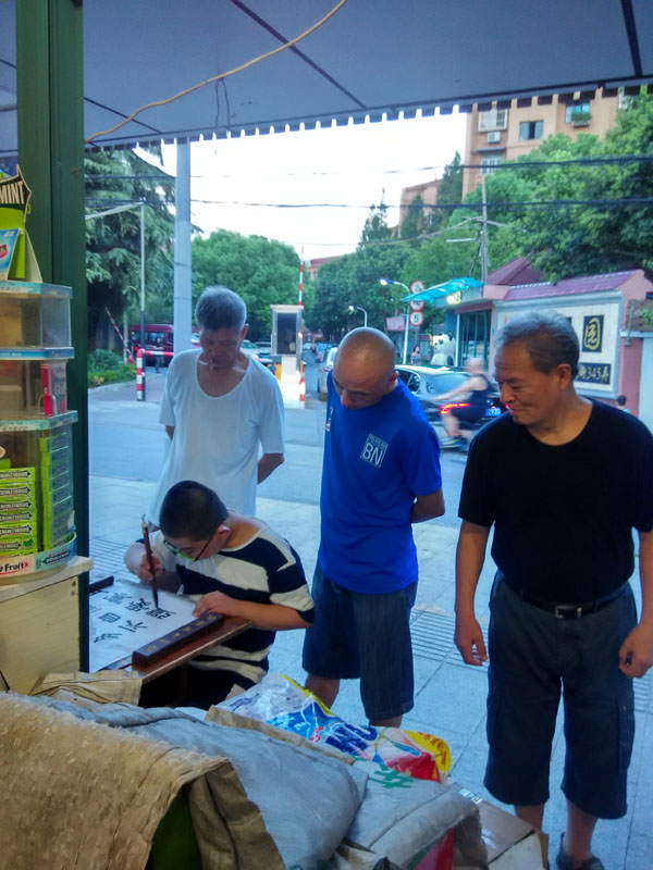 在家长的支持下,余坡同学经常在爸妈开的小店门口,在遮阳帐蓬下支一张桌一个橙就开始练习毛笔字了。【图为路人经过会经常止步观看余坡练字】