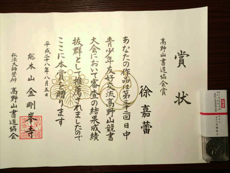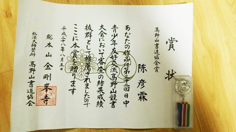 陈彦霖、徐嘉蕾获“高野山书道协会奖”