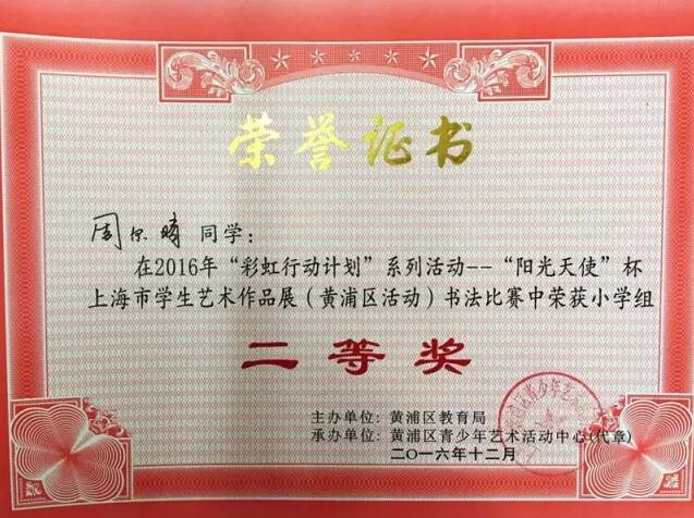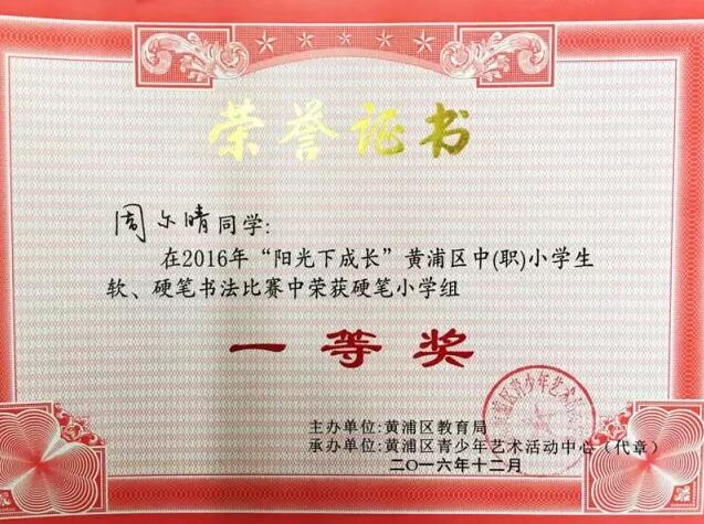大无限艺术学校学员周尔晴分别在2016年“阳光下成长”黄浦区中(职)小学生软、硬笔书法比赛中荣获硬笔小学组一等奖,在2016“彩虹行动计划”系列活动——“阳光天使”杯上海市学生艺术作品展书法比赛中荣获小学组二等奖。