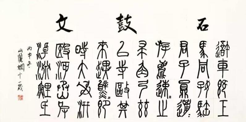 ■ 点评:石鼓文写的疏朗流畅,笔意很好。整体布局良好,石鼓文行书三字尚未到位,希望加强行书的临摹与训练。