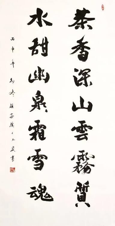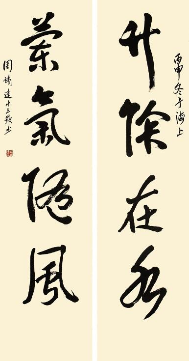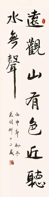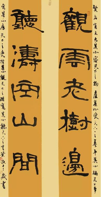 ■ 点评:这件对联写的平整舒展,宽博大度,得《石门颂》笔意。两側齐平的行书款也写得很出色,与大字融为一体。如要进一步提高的话,应从改进个别笔画入手,如"聽"字的长捺不够稳重等。另外,"山"字的变小,造成了周边空白过多与整体稍有不协调感。