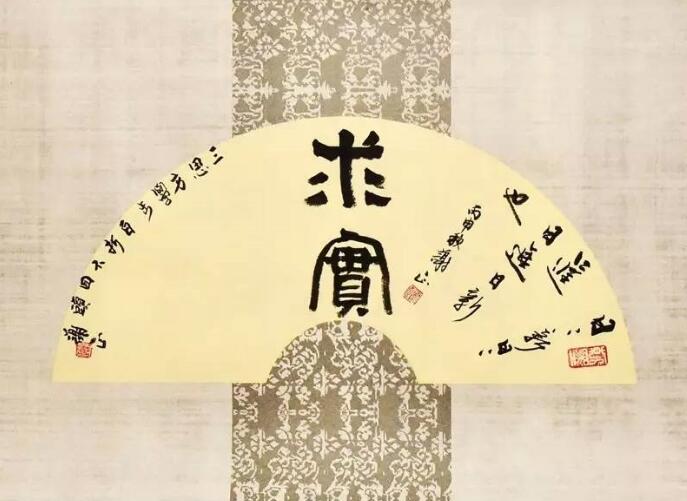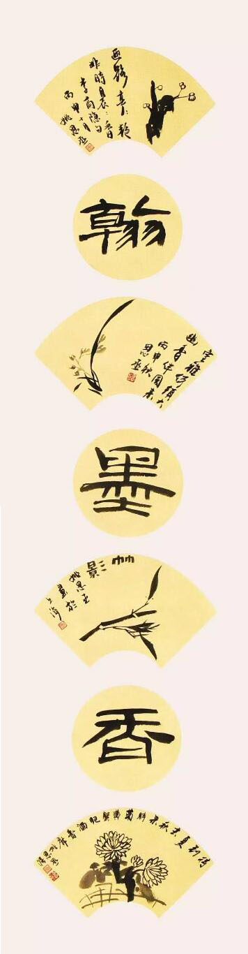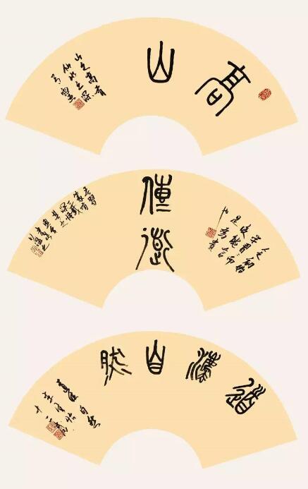 ■ 点评:三个扇面各具一格,充分体现出书法艺术在形式上的无穷变化。篆书为主,行草书为辅的作品中,应进一步加强两者之间的视觉差,形成更为明显的反差效果则更好。