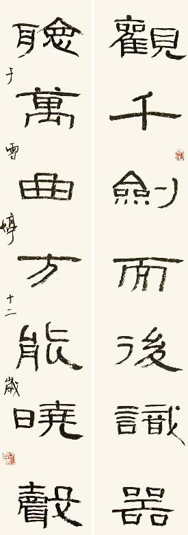 ■ 点评:对联感觉空灵恬淡,线条具有一定的变化,整体大方平稳。个别字如“聼”的撇捺与“識”的捺角较为草率,书写中应多注意度的把握。结体上如能平中见奇则会更有内涵。