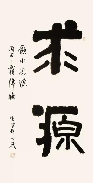 ■ 点评:七岁小孩写四尺大字,非常不易。"求源"两字写得稚趣厚实,隶味初具。可惜款字尚未入门,影响了整体的水平。