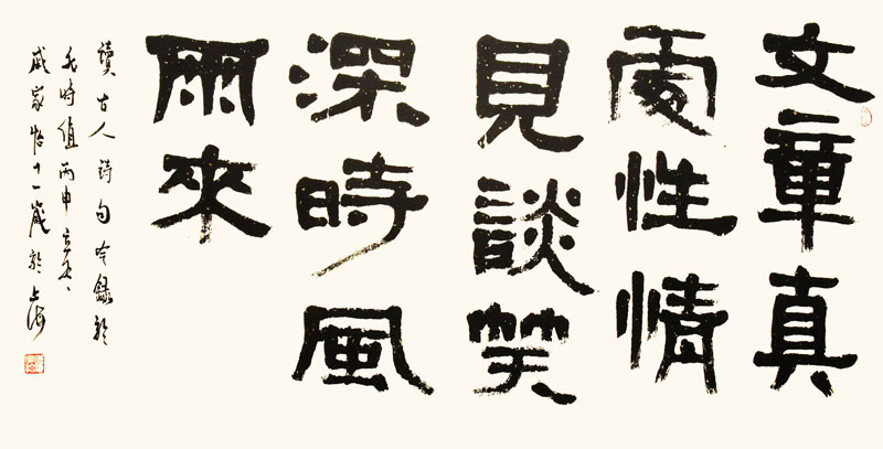 ■ 《天地正气》条幅,从《张迁碑》入门打基础,点画厚重,有汉隶味,大字整体不错,但落款点画太过细弱,希望在今后的学习中要进一步加强这方面的训练。