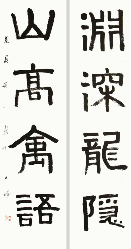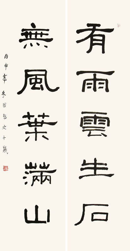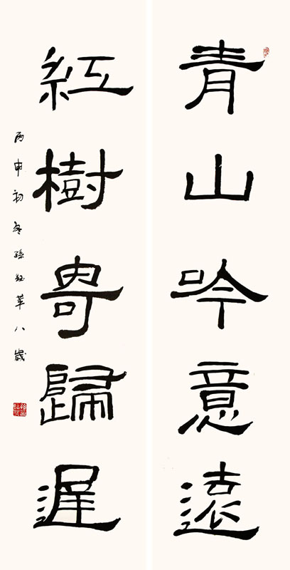 ■ 对联的整体排列做的不错,行笔果断,但《礼器碑》的横细竖粗、瘦挺且滋润的特点未能很好体现,希望能加强这方面的训练。