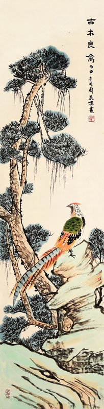 ■ 此件作品立意高雅,完美。松树高古,石头清峻,二友相聚,引良禽来栖。该学生能较好的把握整件作品的用笔、用墨的节奏,锦鸡刻划细腻生动,松干老辣,落款盖章恰到好处。美中不足在于垂藤、松针、有待进一步提高。