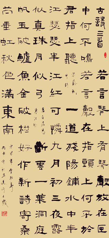 ■ 隶书笔法体现细腻,尤其在线条的变化上掌握较为熟练,整体布局合理工整,书写大气流畅,是件不错的作品。如能在字型结体上多下功夫,效果会更佳。