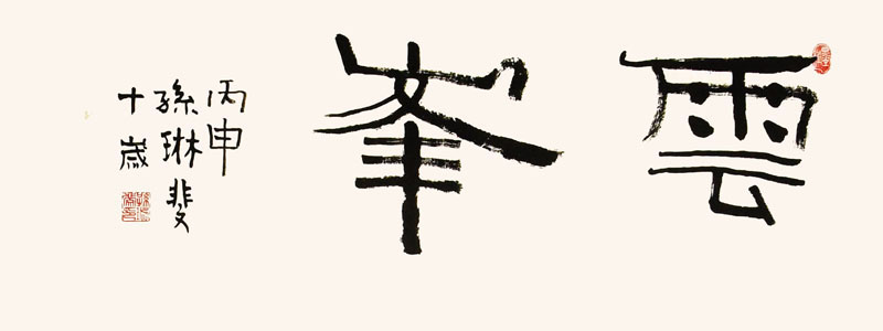 ■ 初学隶书,以汉《礼器碑》笔意书写“云峰”两字,线条基本达到瘦挺、有力的感觉。虽然书写并不熟练,但两字不乏趣味,反而显得古雅。其中已开始加入流动的笔画,使得线条富有变化。希望加强隶书“撇”法的训练。