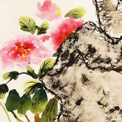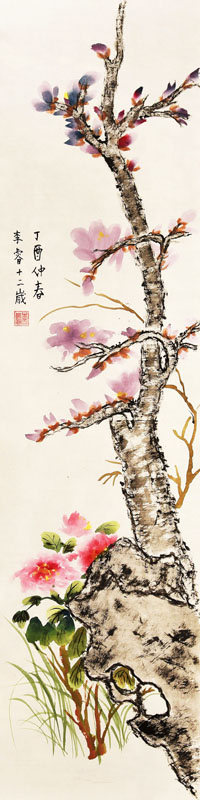 ■ 树画的苍劲有力,石古朴浑厚,花美艳生动,草挺拔有力,是一幅很见功力的作品。略有不足的是印章,建议改用书画专用章。