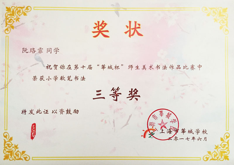 阮珺霏荣获“莘城杯”书法三等奖