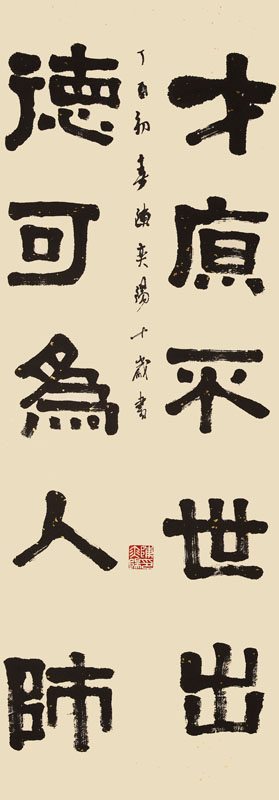 ■ 隶书对联写得朴实拙趣,用笔大胆、率真,结体方正、平稳,对《张迁》方笔运用较到位,作品已初具金石味。但落款行书还有待加强,笔画交代不够清晰,易产生误解,希望多加强款字练习。
