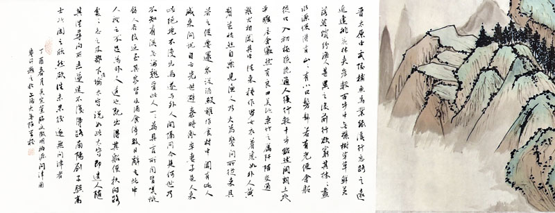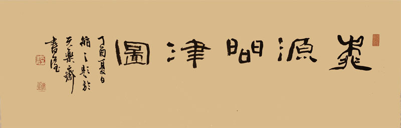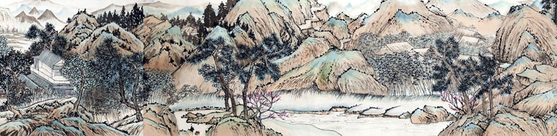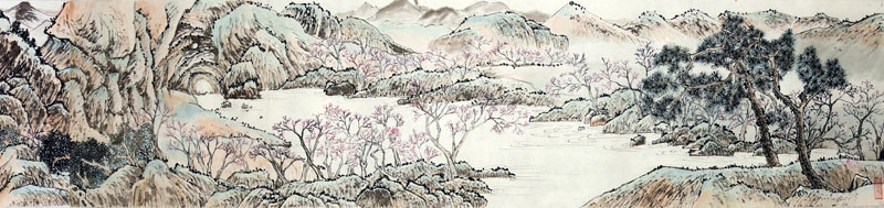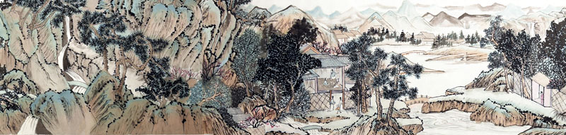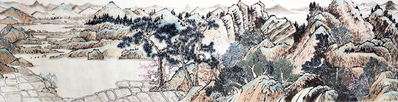 ■ 此件山水作品意临文徵明《桃源问津图》卷,画心长700厘米有余,宽35厘米。卷首有吴寒松校长手题隶书"桃源问津图"几个苍劲有力的大字,移目至画心,一股清新雅致之气迎面而来,让人留恋其中。作品出自一位十五岁女孩之手,能看出其多年的勤奋操练与修为,委实难能可贵。如果说美中不足,应该说是缺少生活与人生的历练吧!