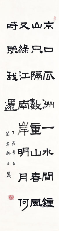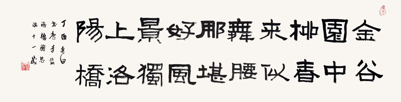 ■ 在四尺对开纸内以横批的形式书写一首古诗,难度较高。隶书用笔到位,线条流畅,写出了隶书碑刻的感觉。由于资历不够,不能完全把握每个字的字形结构,以及字与字之间的联系。另外,还需要加强字与字之间横向的联系、盖小一号的印章等。