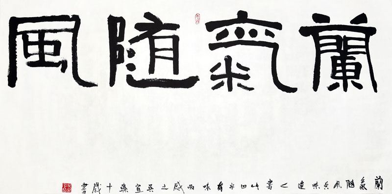 ■ 此件“兰气随风”章法布局巧妙,一破四字安排在画面正中的章法布局,用大量留白来突显四字,显得更有张力。纵观四字结体,如同章法一样,作者开始懂得“计白当黑”,巧妙地使用“疏密”,营造出书法的韵味。唯一可惜的是,“兰”字与其他三字不太和谐,主要是“门”略窄了些。