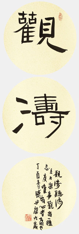 ■ 作品形式独特,追求“观涛”两字正欹变化,并配合落款留白,该同学较好的把握了三圆的关系。隶书用笔沉着中追求畅快,但需注意回峰,减少过于尖锐的笔画,增加拙朴感,并望多加练习行书,则会取得更大成就。