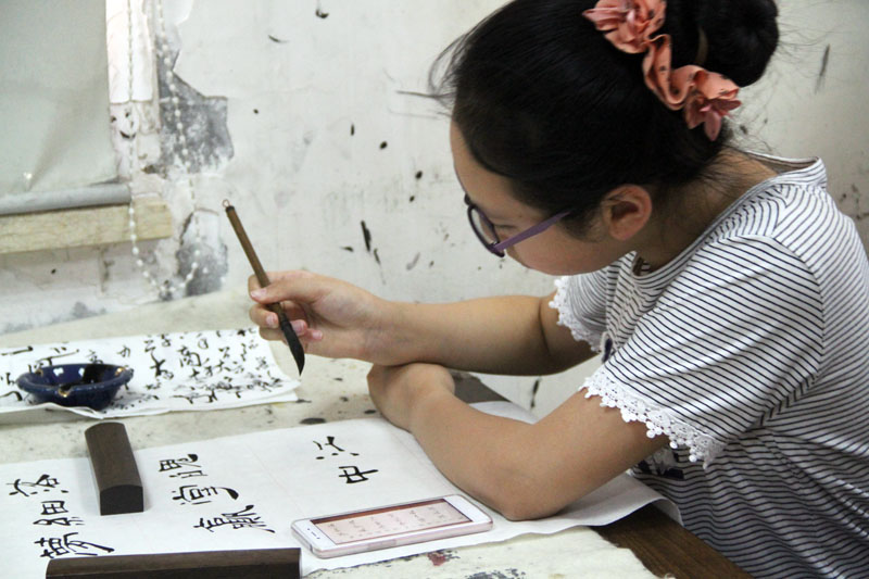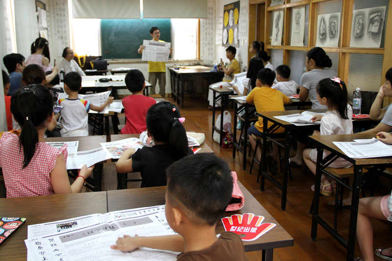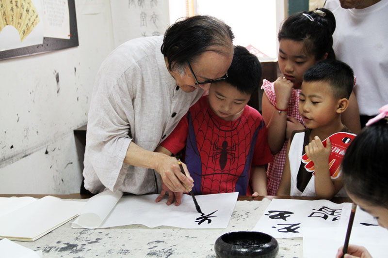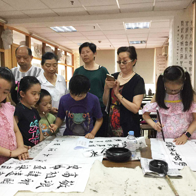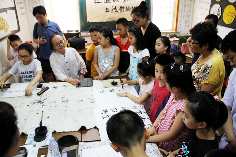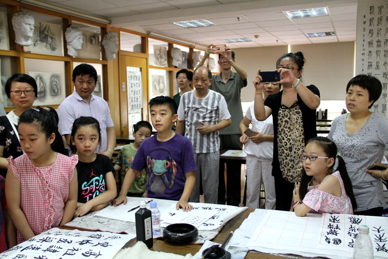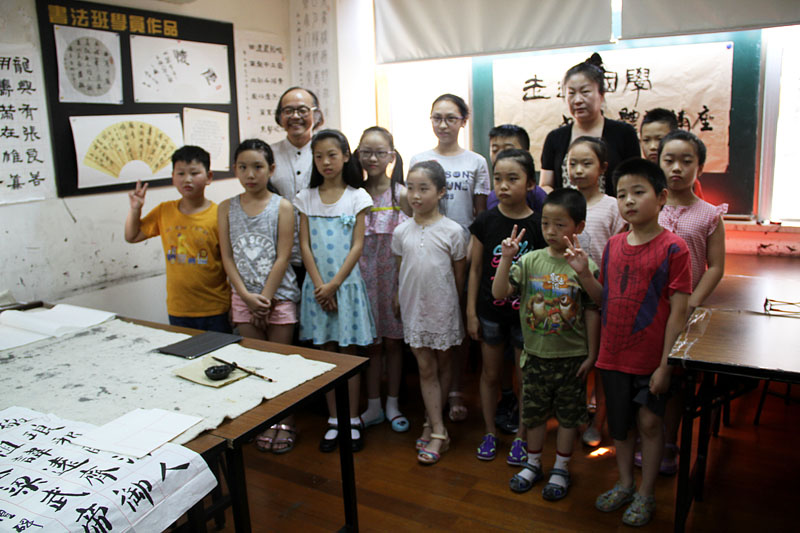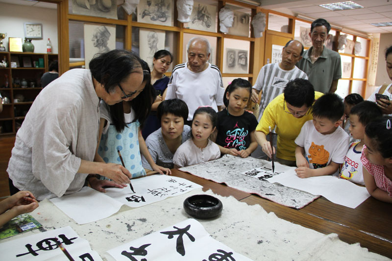 7月24日上午,由黄浦区外滩街道组织的“我要学书法”亲子公益课程,在大无限艺术学校开讲了。