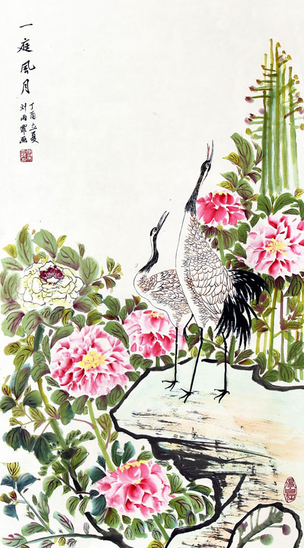 ■ 白鹤长鸣,牡丹富贵,好应景。该学生在此件作品中表现出良好的用笔、用墨、用色的能力。叶子变化丰富,牡丹婀娜多姿,画的很好。今后请注意画石头时的用墨方法。