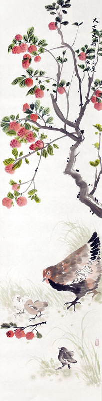 ■ 这是件四尺对开条幅花鸟作品。荔枝、母鸡带小鸡,有大吉大利的好兆头。作品构思巧妙新颖。该学生能较好的把握画面,如果能在出枝及落款上再严谨些,会更好。