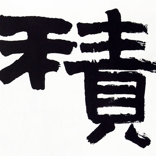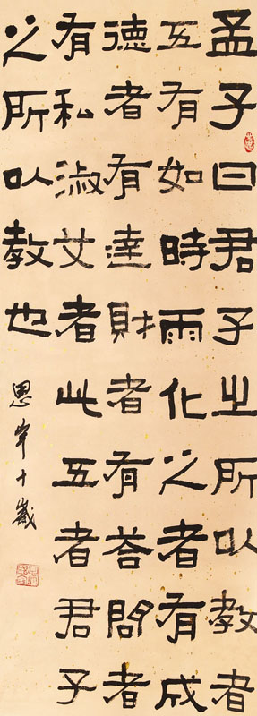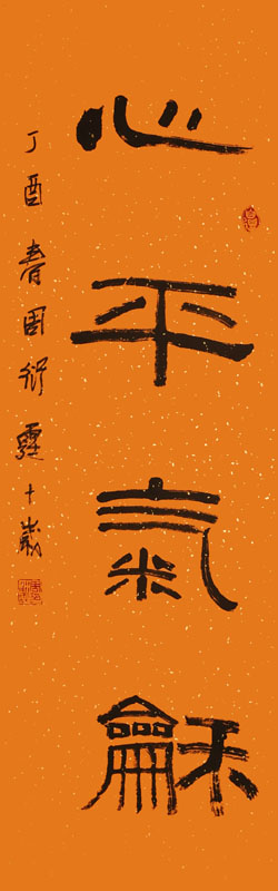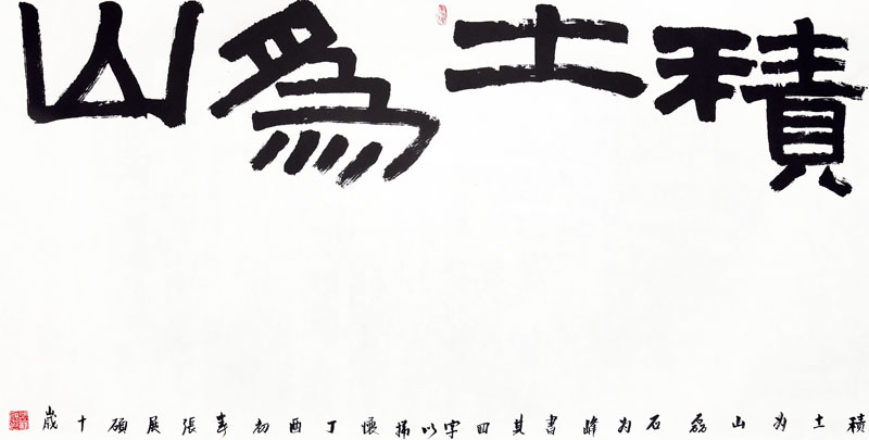 ■ “积土为山”以雄强的汉隶来表现,很契合文意。作者用笔耿直、结体方正有力,较好地体现出那种势不可挡的雄强之气。希望在今后的学习中提高落款行书的水准。