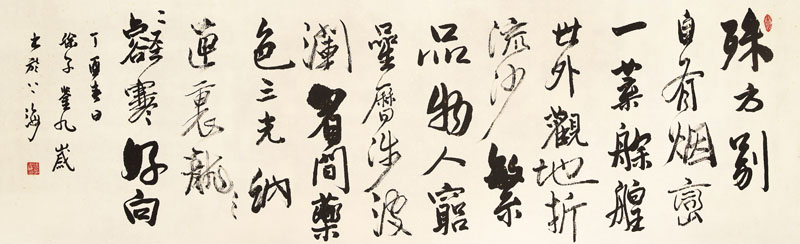 ■ 首次尝试横幅的形式,写出了行书的墨色变化、字的大小变化以及行距之间的变化。缺点是款识写的小了些,与整体不够协调。