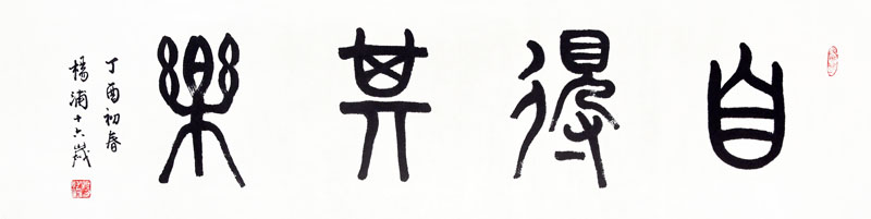 ■ "自得其乐"四个篆书写的圆浑、婉转,又有韧劲。整体章法成熟、得体,是一件优秀的作品。努力方向:增加竖线条的速度,更多地表现运笔的节奏感。