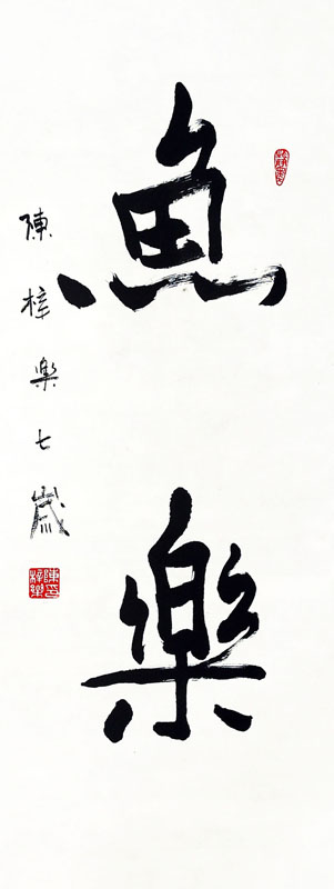 ■ "鱼乐"两个行书写的灵动、圆润,因初学虽为处女之作,却能如此淡定、无拘无束,实在不易。当然,要把行书笔法学到手,尚须時日。