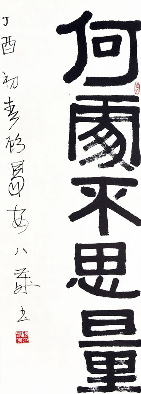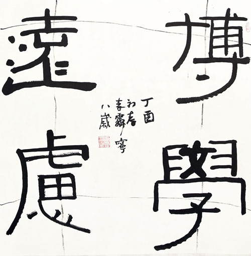 ■ 此件作品线条朴实无华,结体方正有力,是一件较有古意的隶书作品。在用笔上还略显生疏,用墨的变化也显不足,希望在日后的学习中提高起来。