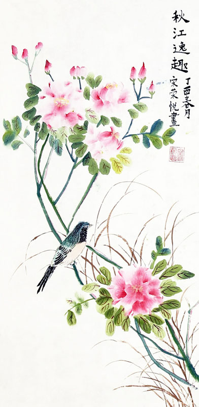 ■ 芙蓉花用笔用色生动活泼,韵味十足,小鸟用笔造型肯定,叶子用色变化丰富,但勾茎略显板滞,少变化。这是一个学习一年不到的学生作品,很不错。