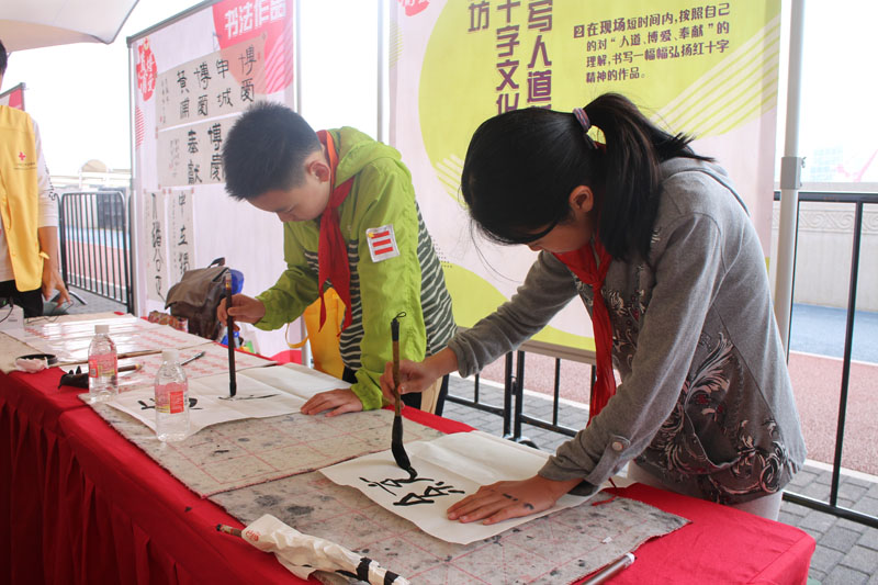 学员现场书写了代表红十字精神——“人道、奉献、博爱”、“人道公正、中立独立”、“志愿服务、统一普遍”,等六件作品。用一幅幅书法作品 “谱写人道新篇章”,获得了活动组织者、在场观众和志愿者们的交口称赞,纷纷拿起相机和手机与学生们合影留念。