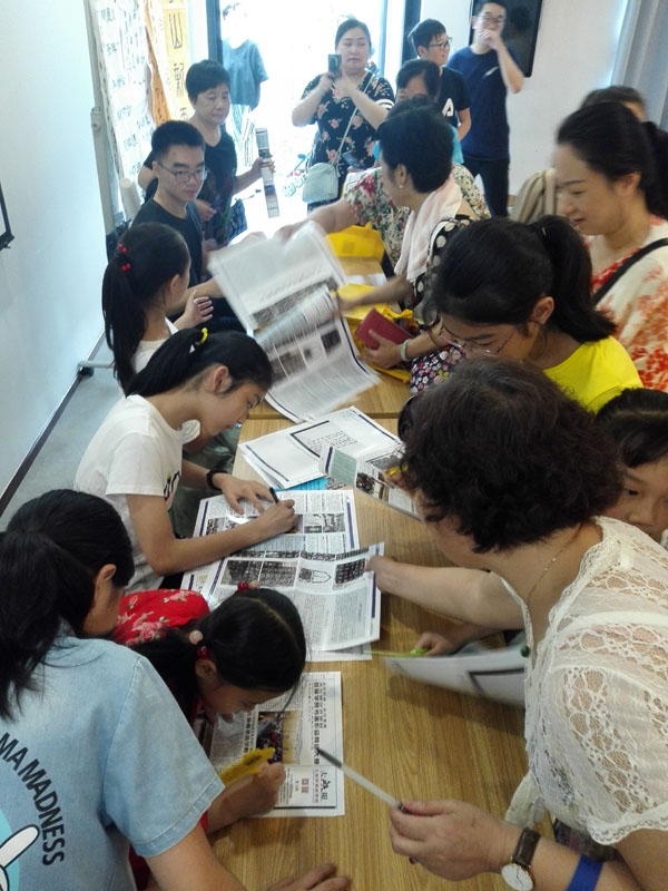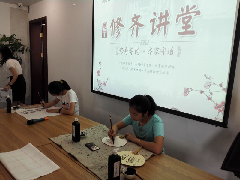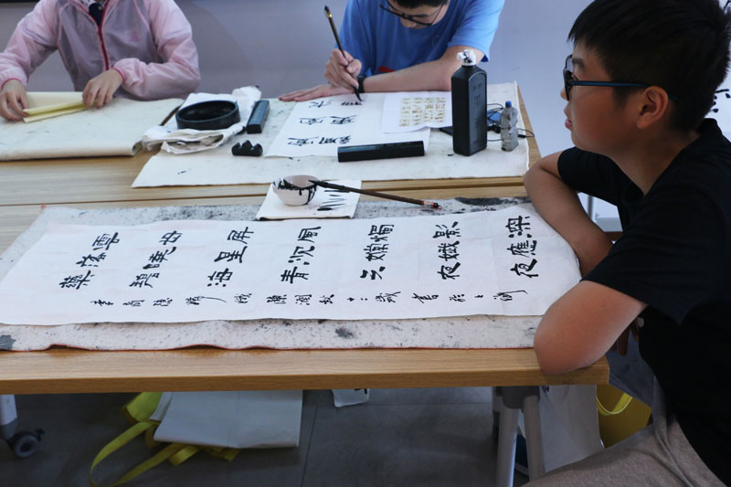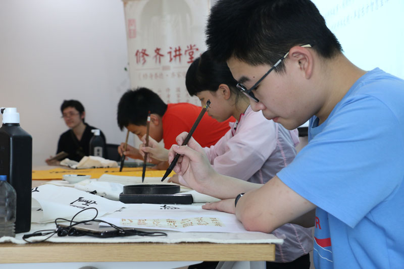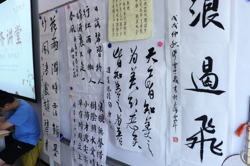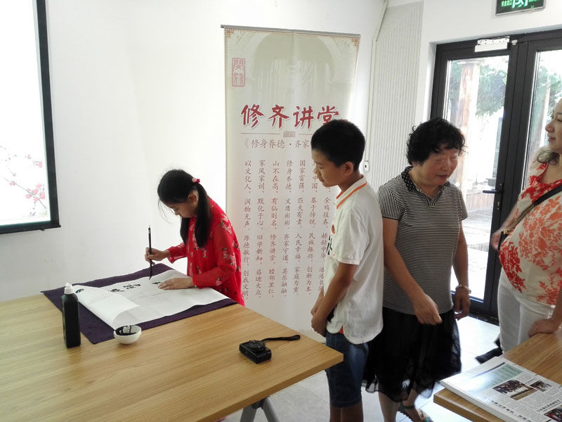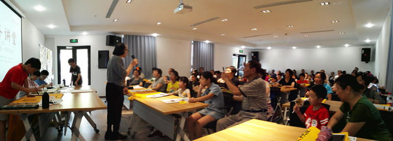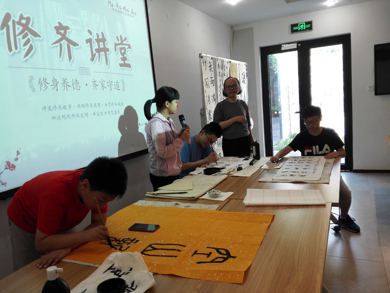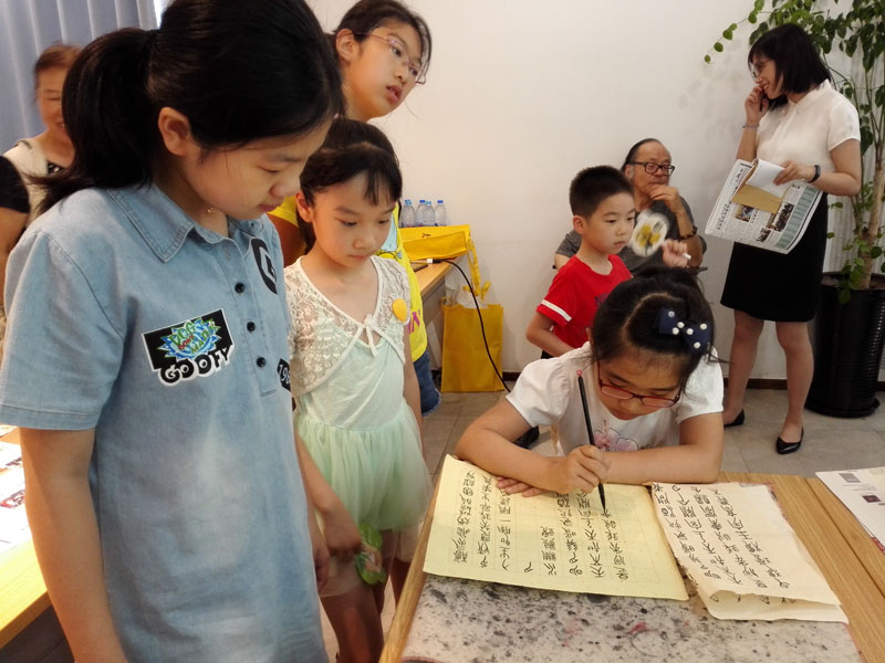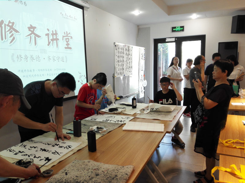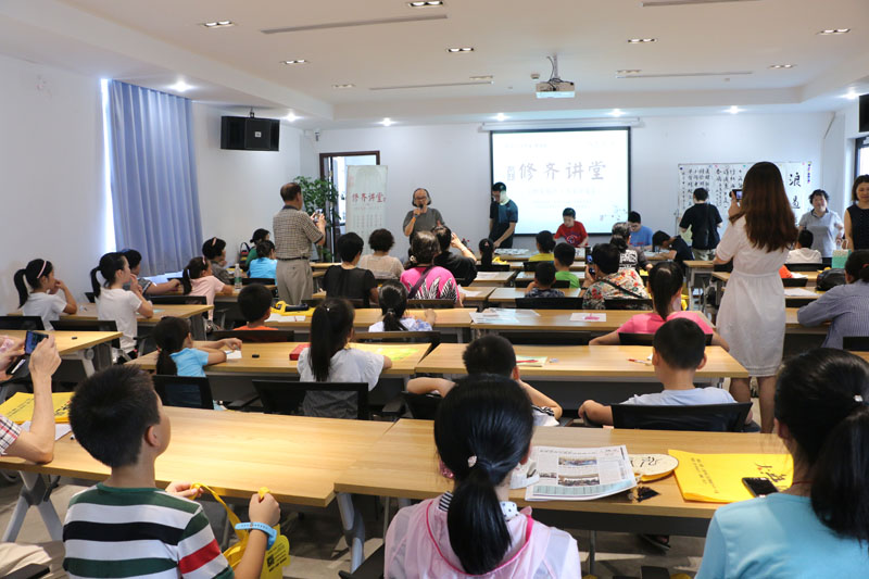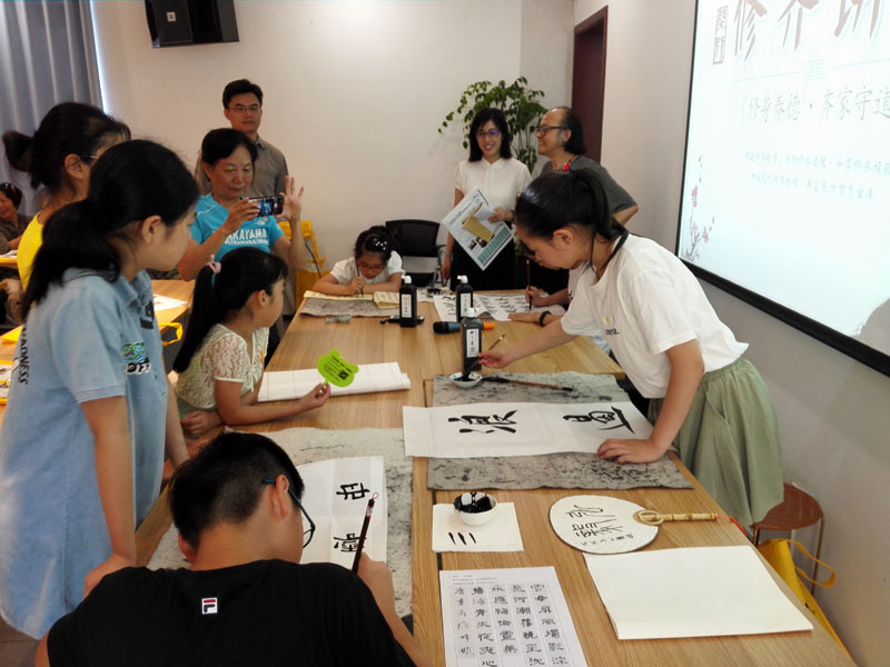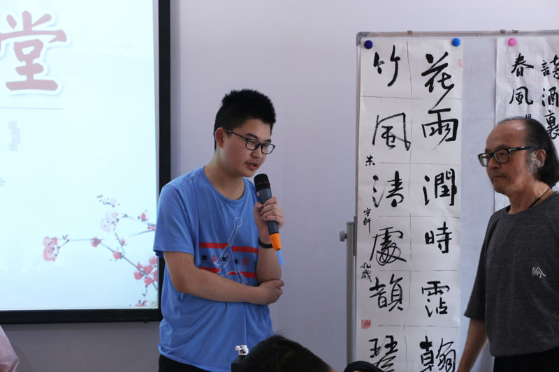 2018年7月26日上午,一个题为《汉字的起源》专题公益讲座在闵行区益梅小院举行。讲座开始前,大无限艺术学校的学员为梅陇地区的青少年书法爱好者和居民当场挥毫,学员们用正草隶篆各种书体写成的一件件作品,赢得了在场观众的一致好评。讲座结束后,这些学员还与在场的青少年爰好者进行互动,为他们签名留念。大无限艺术学校吴寒松校长深入淺出,生动活泼的讲演给大家留下了深刻的印象。