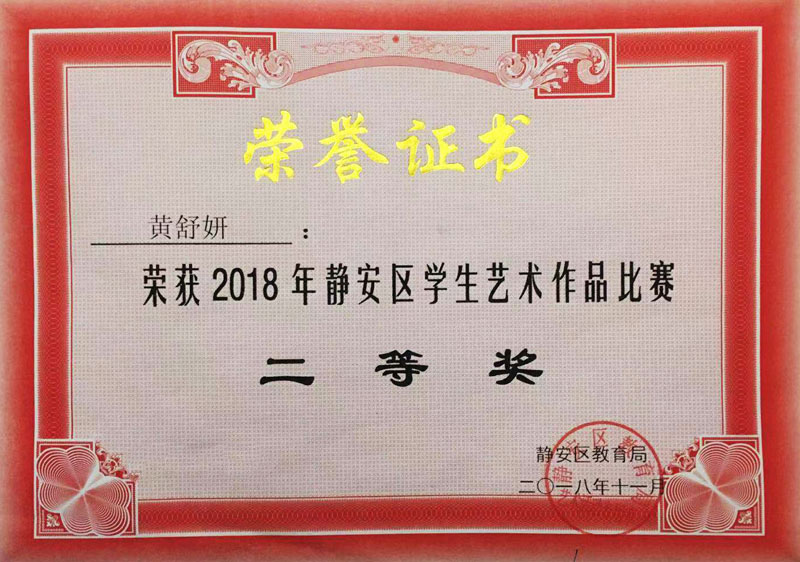 黄舒妍在静安区教育局主办的“2018年静安区学生艺术作品比赛中”,书法作品荣获二等奖。