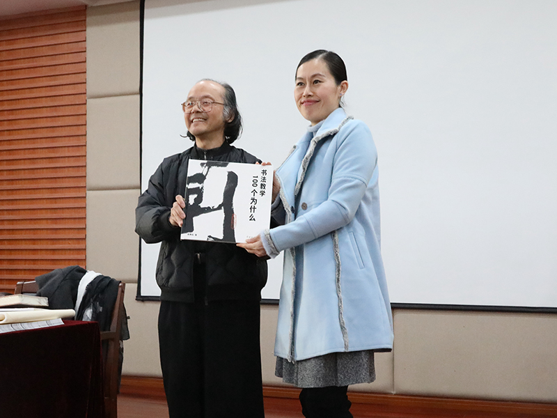 讲座开始前,大无限艺术学校校长吴寒松还向上海市第二中学图书馆赠送了三套书画教材,该校崔鹏校长在赠送仪式上与吴寒松校长合影。