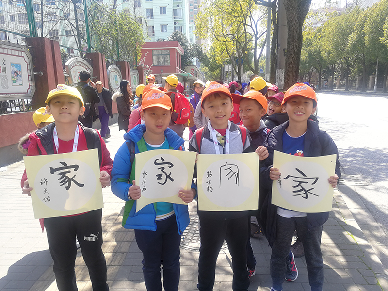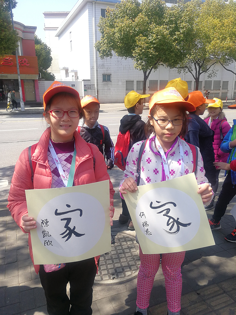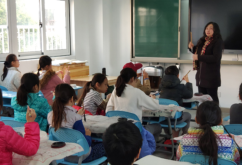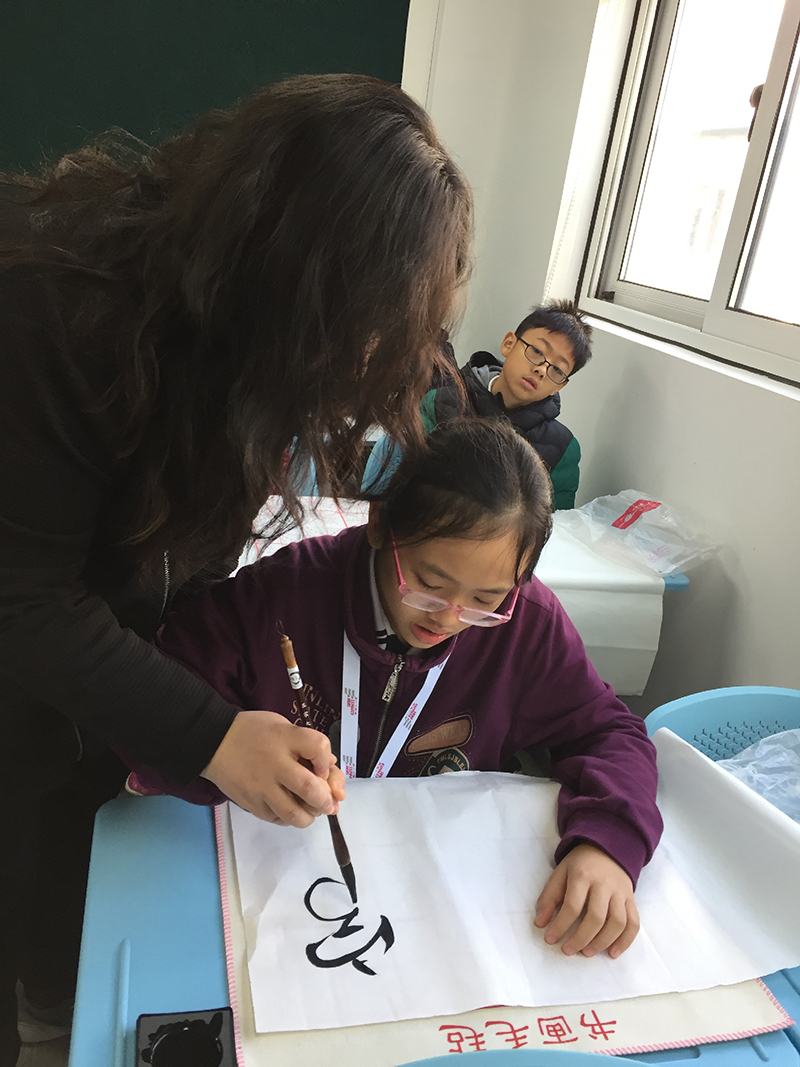 313日上午,应七宝实验小学邀请,大无限艺术学校教师周琦为前来上海七宝实验小学交流的32位新加坡学生,上了一堂特殊的书法体验课。