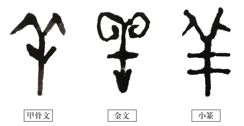 这本来是一个牛羊的“羊”字,甲骨文正面看为羊头形,上部羊角下弯,下部是羊的嘴巴。“羊”是一个象形字。金文强化了羊头的形象,似乎特指“绵羊”。为了便于书写,小篆虽然将金文的圆线变为直线,但是“羊头”的基本形象未变,只是更为抽象和符号化而已。