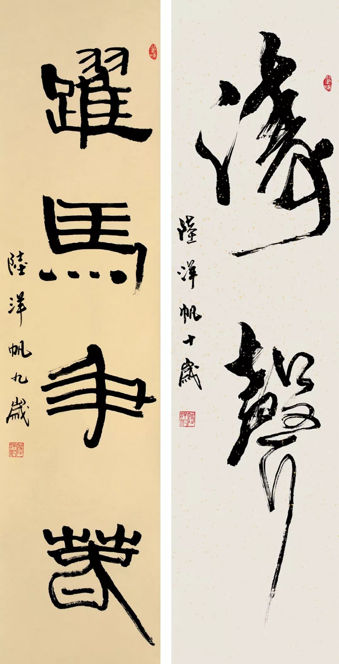 ▲ 陆洋帆隶书《跃马争春》(左)、行书《涛声》(右)