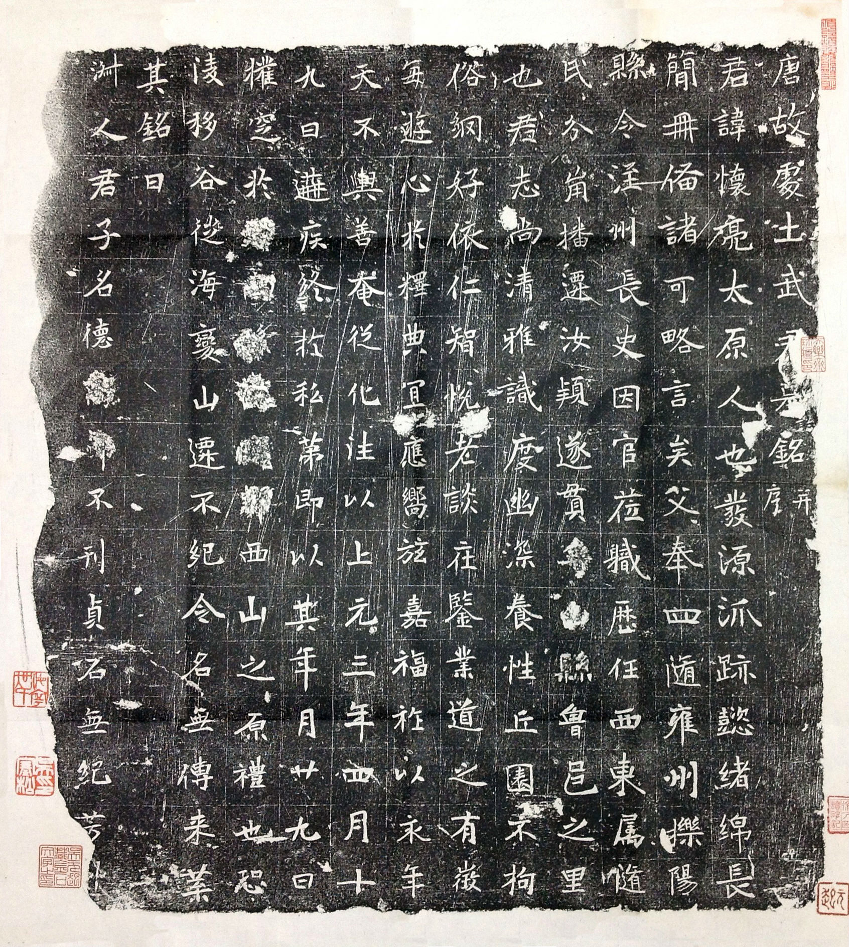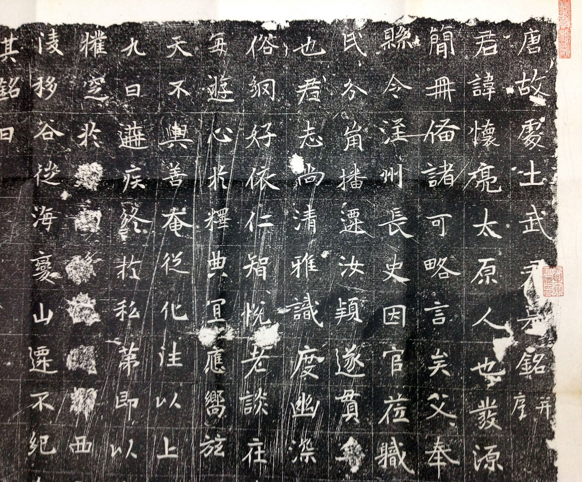 《唐武怀亮墓志》,全称《唐故处士武君墓志铭并序》。志石宽56cm,高56cm,界格,楷书近魏碑体。志文字不多,共14行,满行16字,仅200余字,字形较大,魏碑味浓,刻工较精,为唐代志石中少见的“魏碑”风格墓志铭。著名收藏家吴元起盖有“元起”、“吴元起藏金石文字之印”朱文章两方。