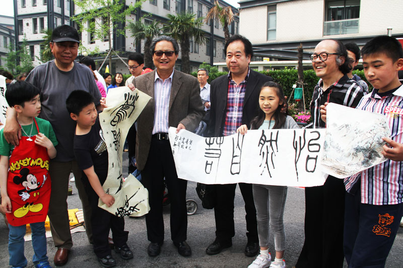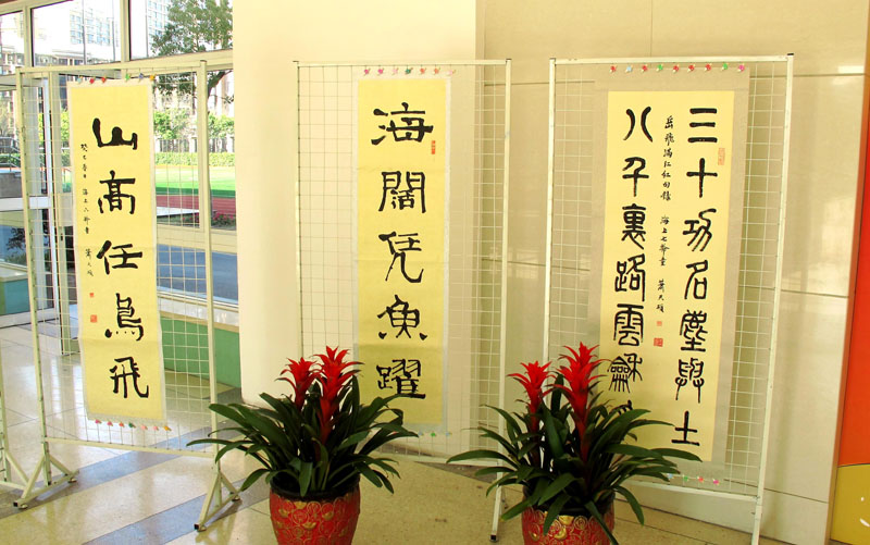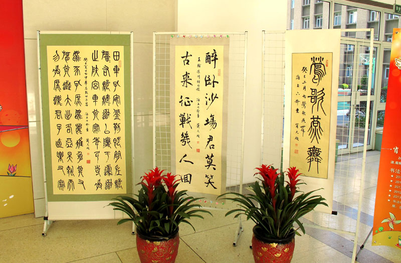 【图片依次为:1、个人展现场  2、大无限成语展上与上海市书法家协会主席周志高、副主席丁申阳合影  3、地铁文化宣传窗口】