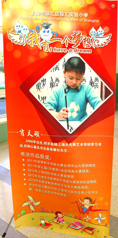 日前,上海市徐汇区徐汇实验小学为大无限艺术学校青少年学员肖天硕举办了一个书法展,集中展出了他篆、隶、行各体书法作品。