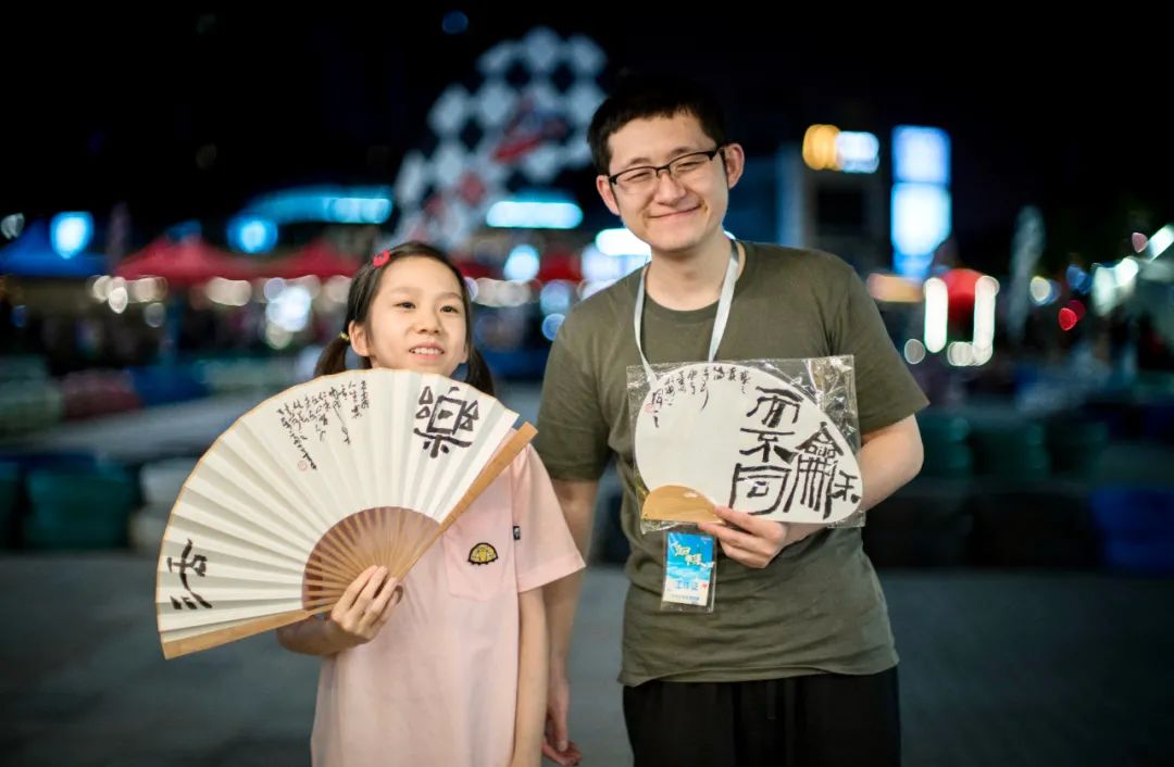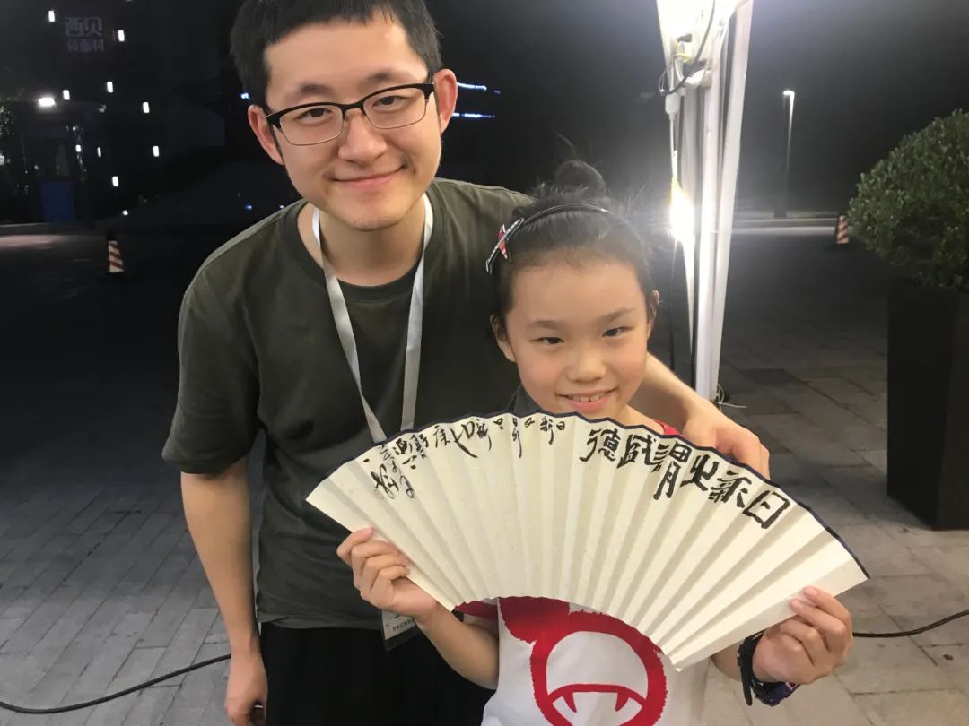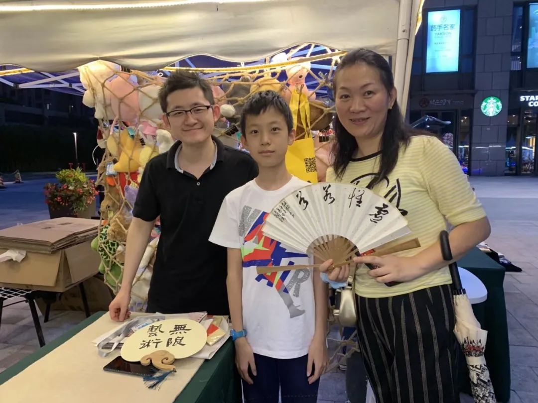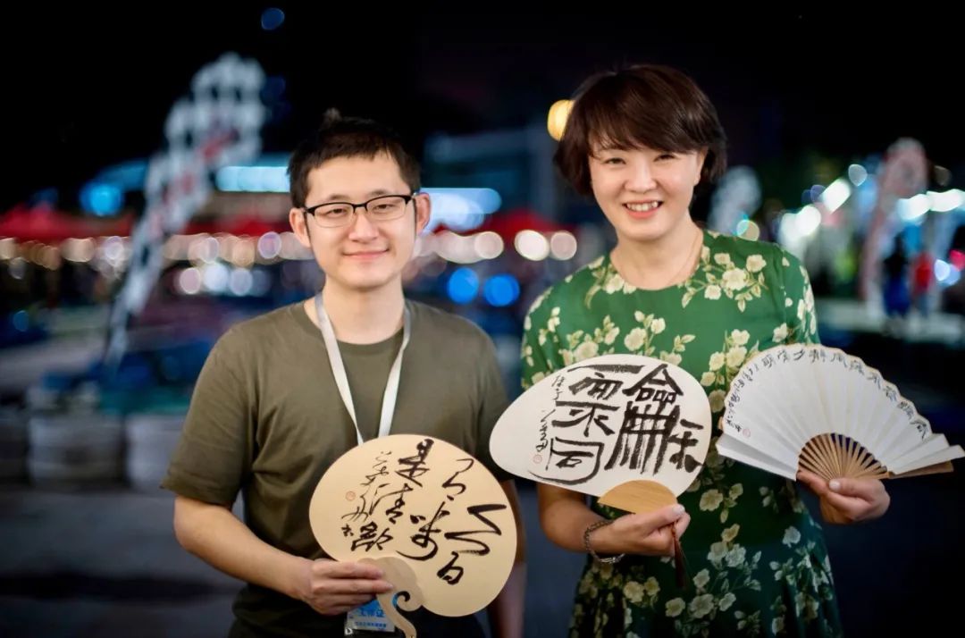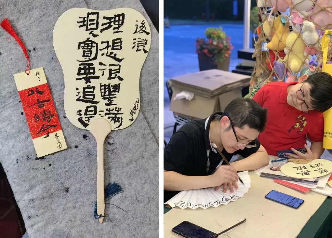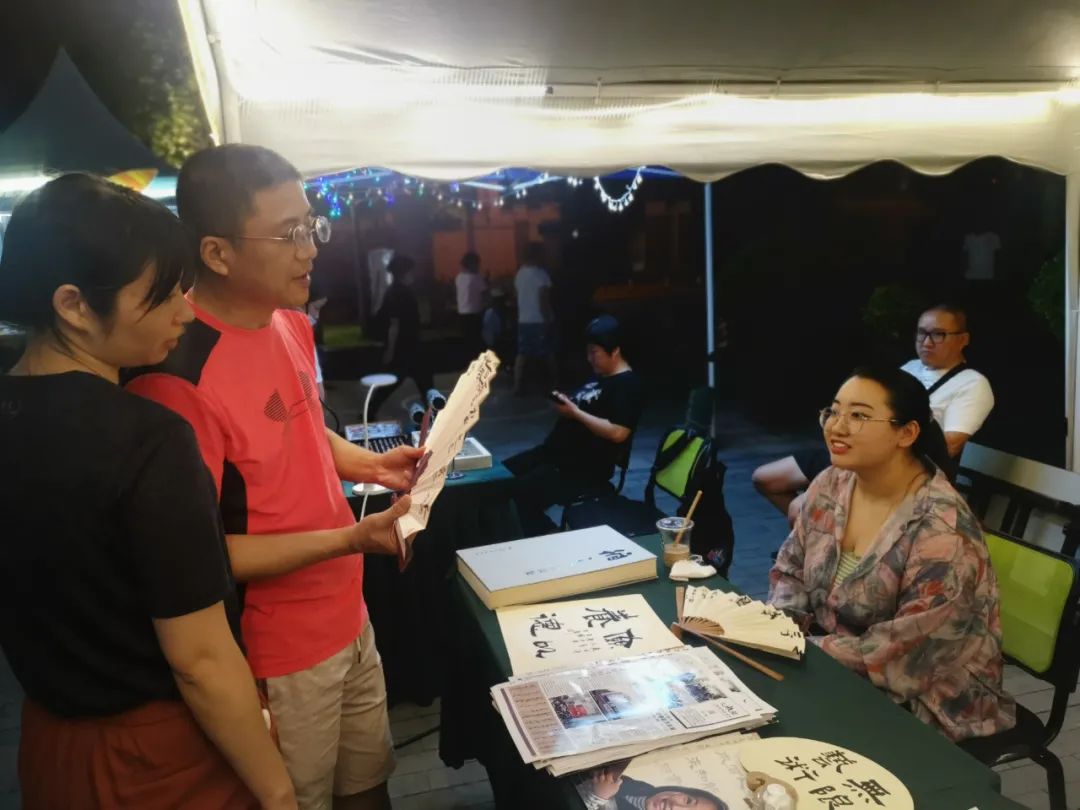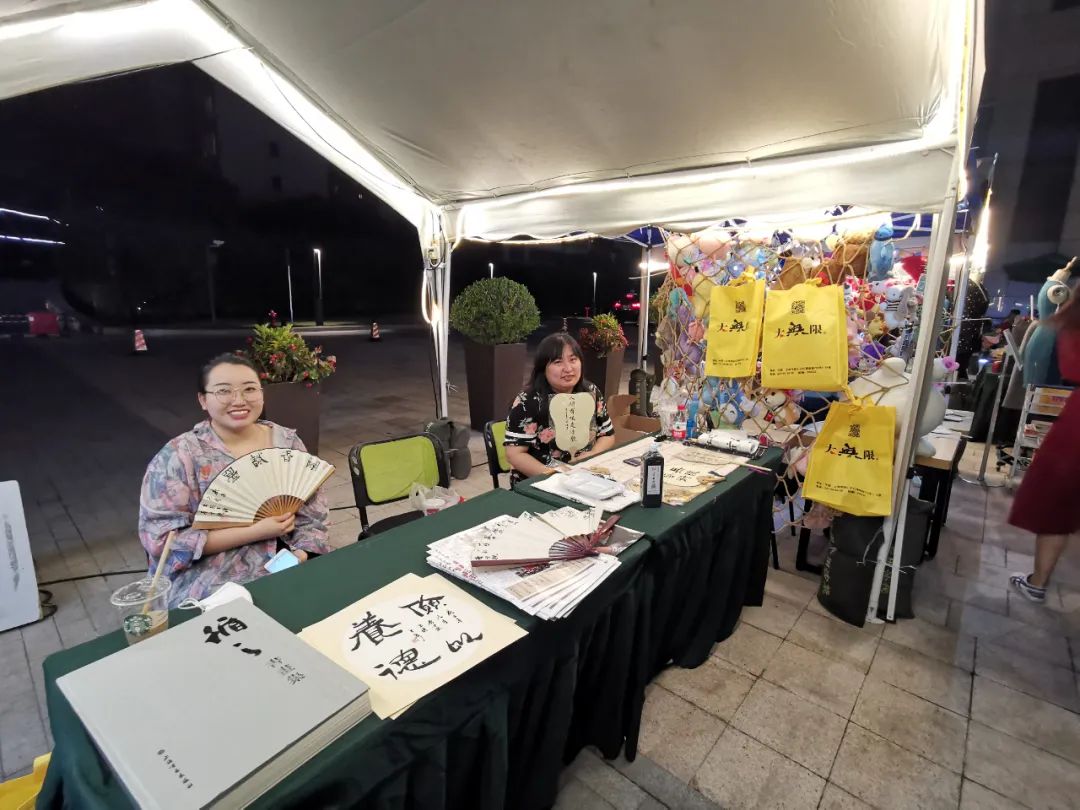大无限艺术学校校长吴寒松拿出精心创作的两件扇面作品,并派出副校长吴叶舟、年轻教师周琦、胡珍妮、施小婕、叶聿圣、马文虎、唐尹洁、孔静露、李韵、王佳琛,轮流上阵,为1699广场的夜市地摊注入书画艺术元素。席间,学员陈奕阳也来到在现场秀了一把书法,并通过网络通道售出了自己现场书写的作品。