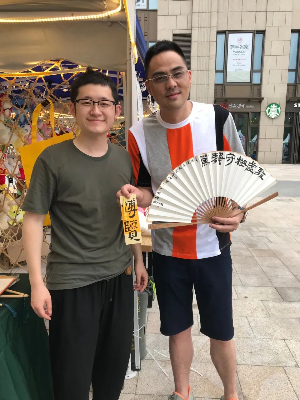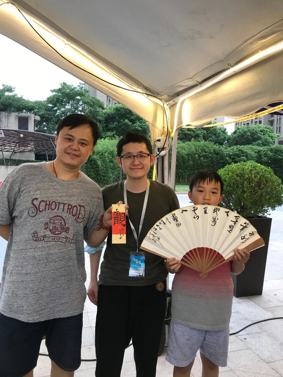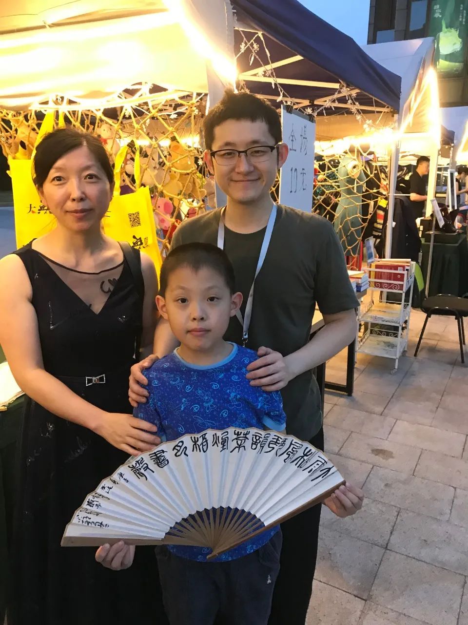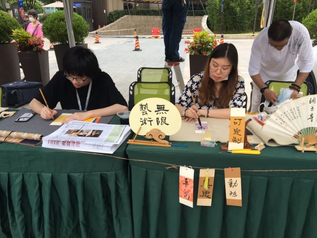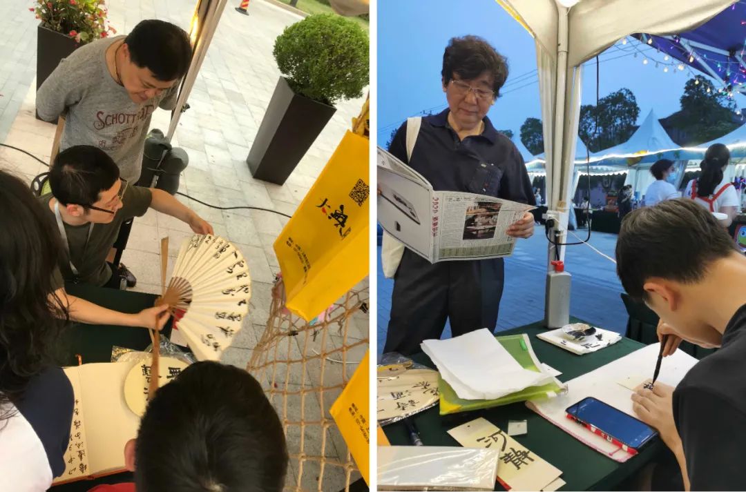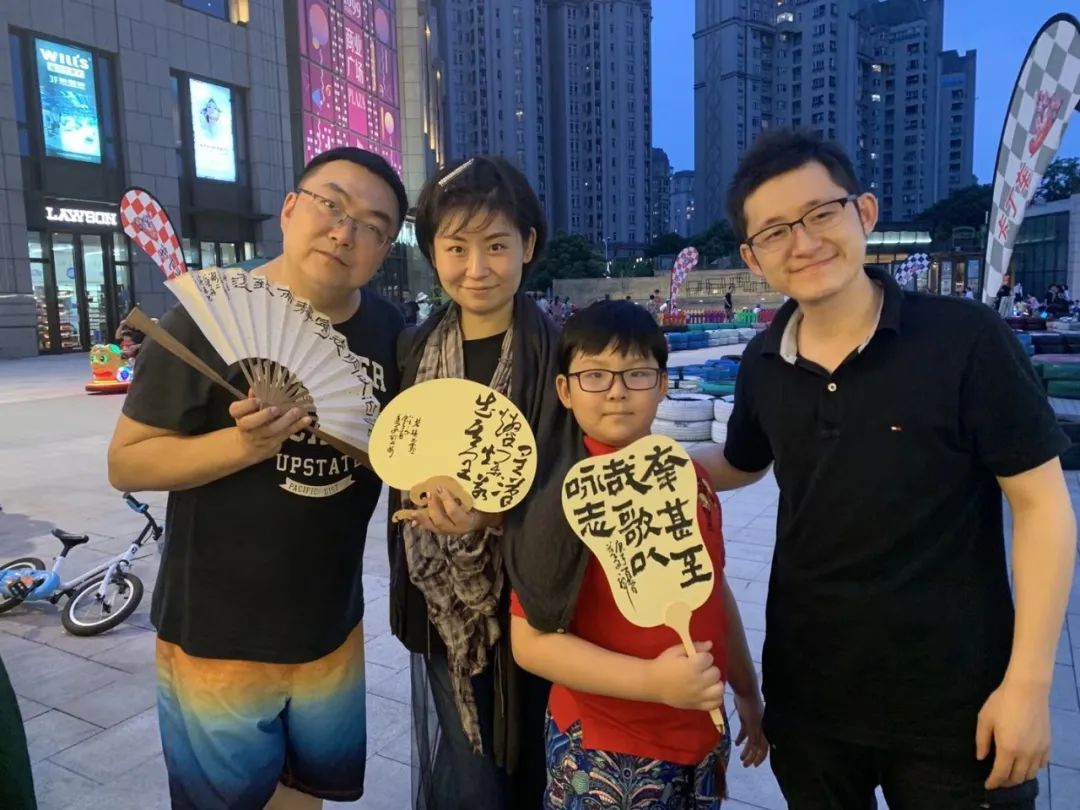 大无限艺术学校校长吴寒松拿出精心创作的两件扇面作品,并派出副校长吴叶舟、年轻教师周琦、胡珍妮、施小婕、叶聿圣、马文虎、唐尹洁、孔静露、李韵、王佳琛,轮流上阵,为1699广场的夜市地摊注入书画艺术元素。席间,学员陈奕阳也来到在现场秀了一把书法,并通过网络通道售出了自己现场书写的作品。