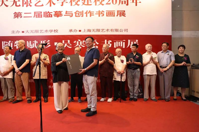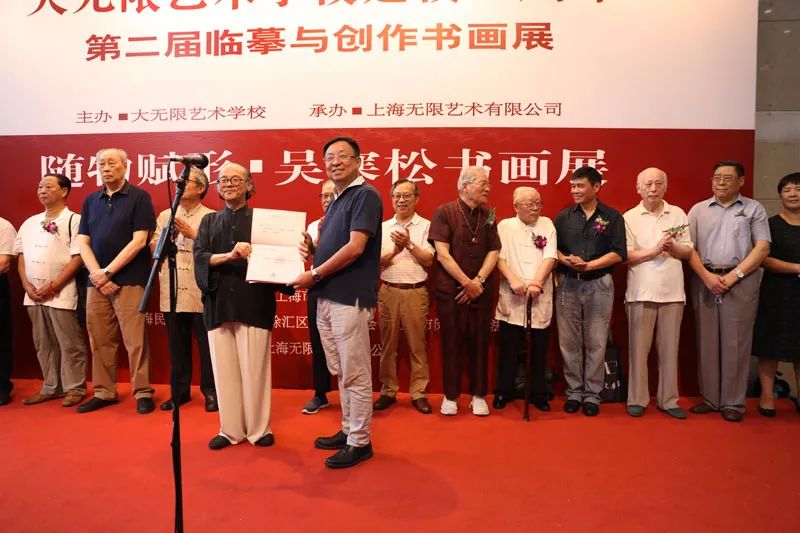 展览开幕之际,《大无限艺术学校建校二十周年——第二届临摹与创作书画作品集》和《循之书画集》同时与大家见面。吴寒松先生向上海图书馆捐赠图书,上海图书馆党委书记楼巍向吴寒松颁发捐赠证书。