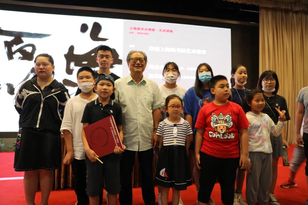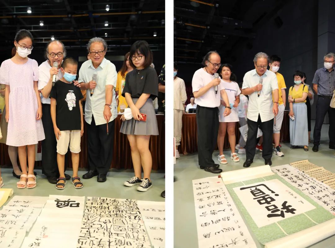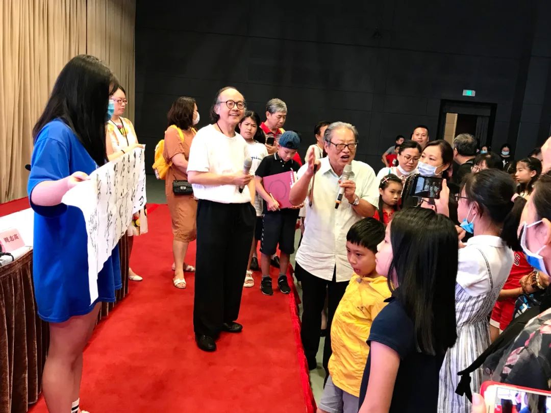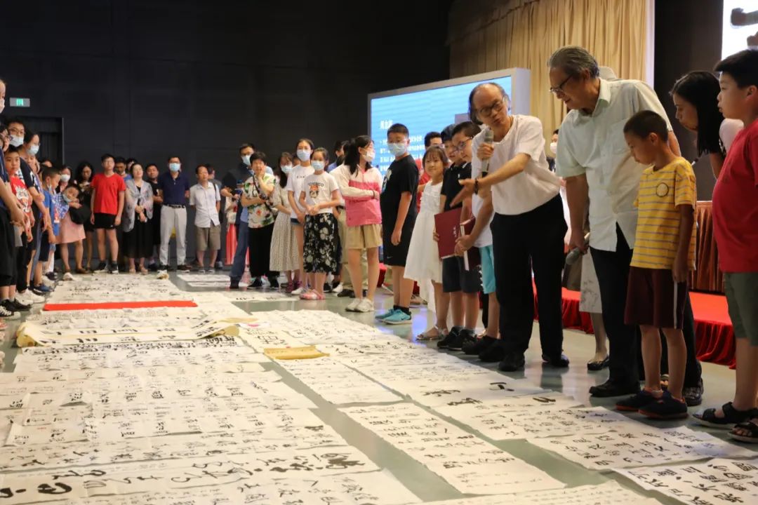 讲座中,周主席不仅在互动环节一一回答大家的提问。还在讲座结束时,走下讲台,为正在热爱书法学习的学生点评习作,并与所有参与听讲的中小学生合影留念。