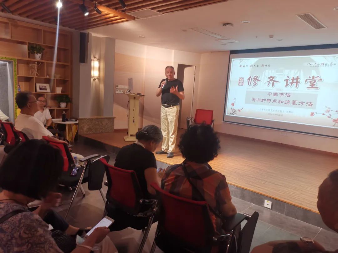 2020年8月20日,大无限艺术学校吴寒松校长应邀来到闵行区古美艺术中心,再次在“修齐讲堂”,为社区书法爱好者讲了一堂题为“隶书的特点与临摹方法”的公益讲座。