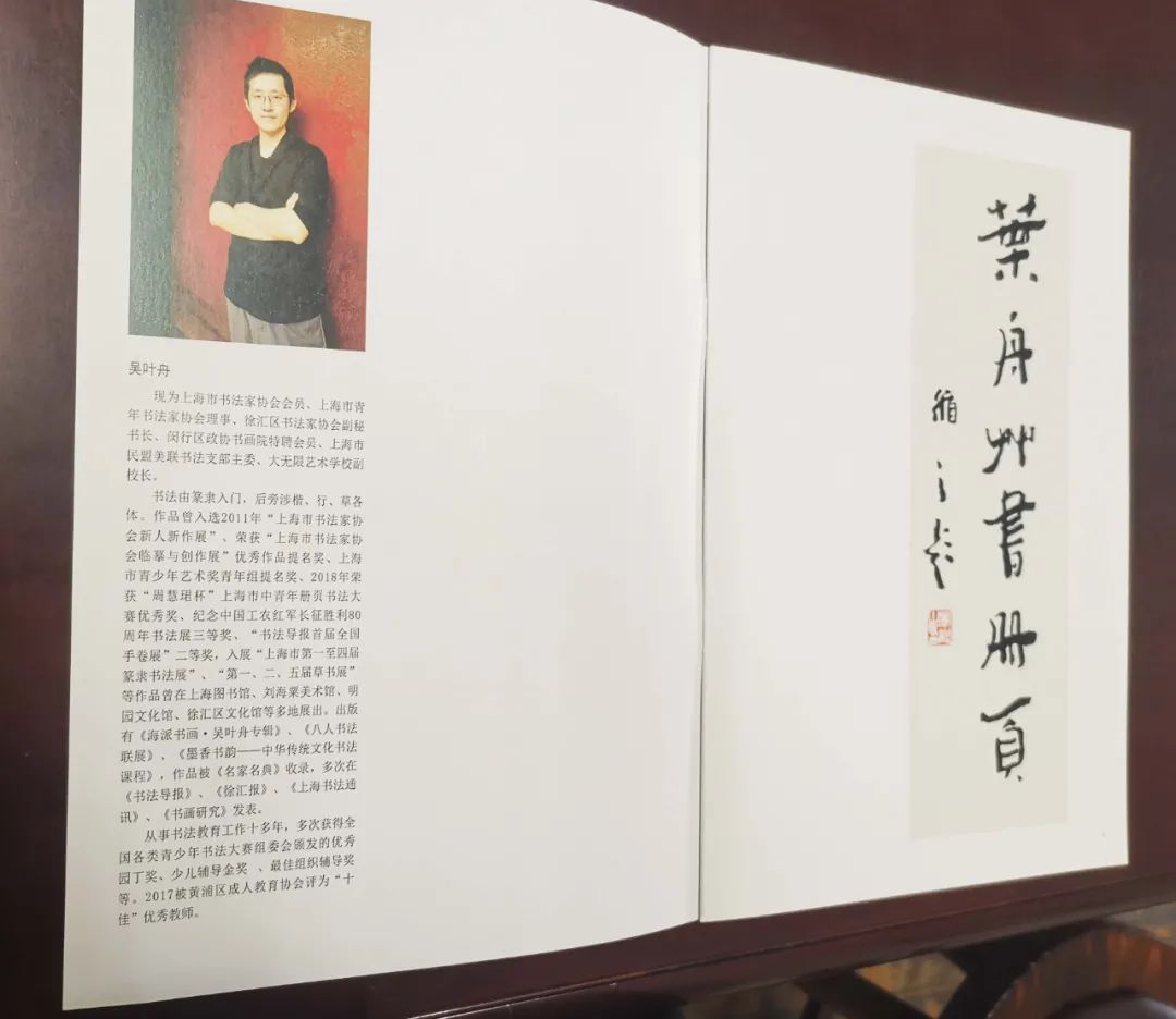 现为上海市民盟美联书法支部主委、上海市书法家协会会员、上海市青年书法家协 会理事、上海书协篆隶委员会委员、徐汇区 书法家协会副秘书长、大无限艺术学校副校 长。 书法由篆隶入门,后旁涉楷、行、草各 体。作品曾入选2011年“上海市书法家协 会新人新作展”、荣获“上海市书法家协 会临摹与创作展”优秀作品提名奖、上海 市青少年艺术奖青年组提名奖、2018年荣 获“周慧珺杯”上海市中青年册页书法大 赛优秀奖、纪念中国工农红军长征胜利80 周年书法展三等奖、“书法导报首届全国 手卷展”二等奖,入展“上海市第一至四届 篆隶书法展”、“第一、二、五届草书展” 等作品曾在上海图书馆、刘海粟美术馆、明 园文化馆、徐汇区文化馆等多地展出。出版 有《海派书画·吴叶舟专辑》、《八人书法 联展》、《墨香书韵——中华传统文化书法 课程》,作品被《名家名典》收录,多次在 《书法导报》、《徐汇报》、《上海书法通 讯》、《书画研究》发表。 从事书法教育工作十多年,多次获得全 国各类青少年书法大赛组委会颁发的优秀 园丁奖、少儿辅导金奖 、最佳组织辅导奖 等。2017被黄浦区成人教育协会评为“十 佳”优秀教师。
