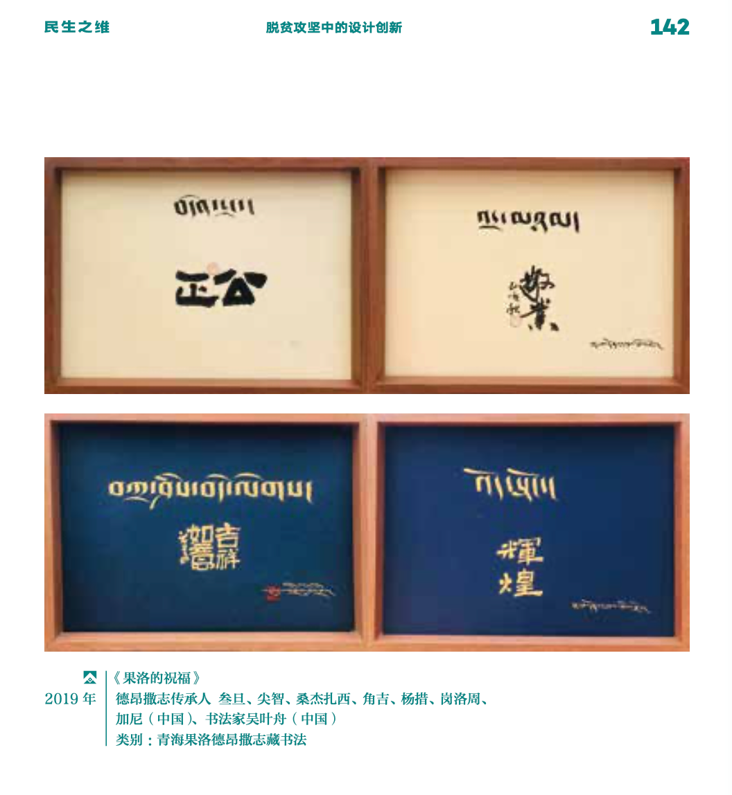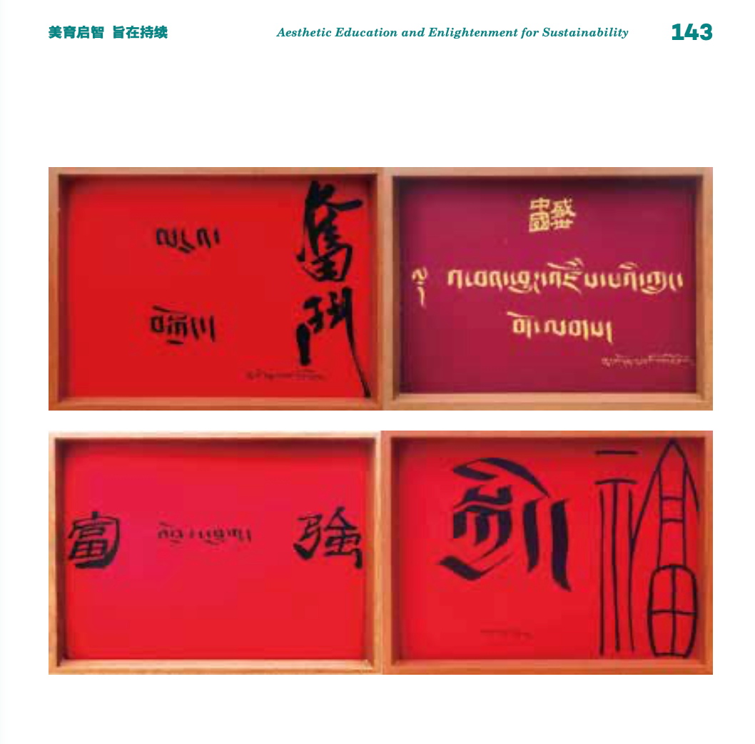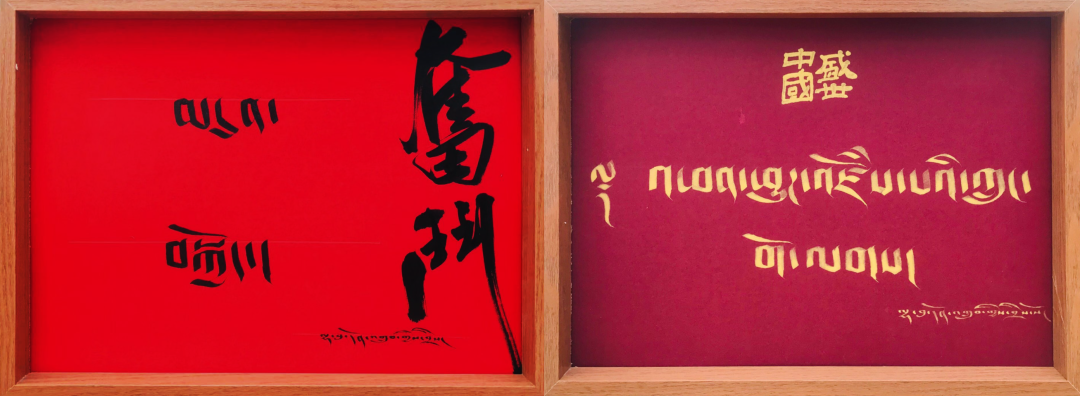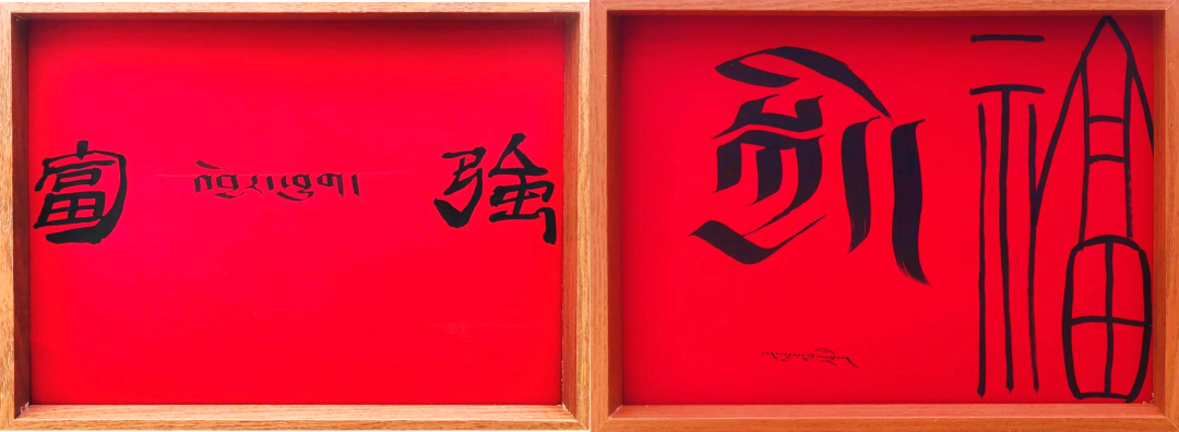 作品以社会主义核心价值观,富强、民主、文明、和谐等为创作内容,将汉族书法与藏族书法在同一平面中通过布局、形式的不同组合,形成新的视觉感受与意象。通过创造性转化及创新性发展,解决了藏族书法看不懂的问题,将很局限的果洛非遗技艺德昂洒智书法带到公众视野中,让非遗走进现代生活。