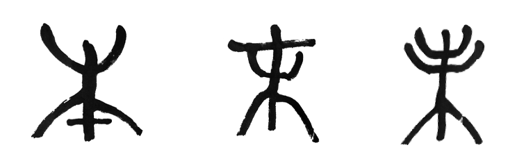 “木”字,《说文解字》云:“冒也。冒地而生。”在甲骨、金文中完全是一颗树的形象。小篆只是变直线为弧线,起到装饰作用而已。不管是甲骨、金文还是小篆,上部表示树枝,下部表示树根。