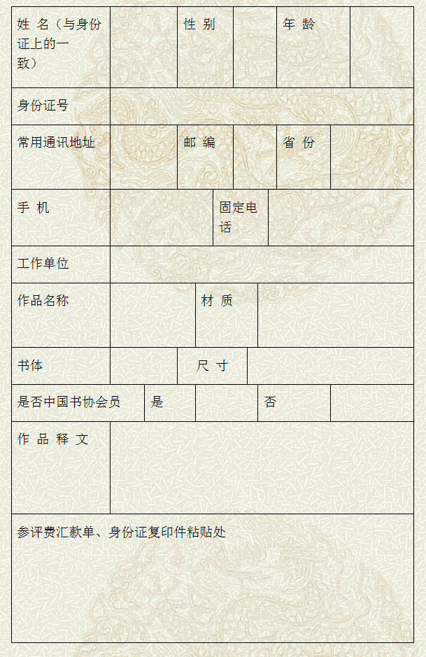 5、填写信息: 请在作品背后右下方用铅笔正楷注明:姓名、性别、身份证号、所属省份、常用通讯地址、邮编、联系电话(固定电话、手机),草书、篆书请附释文,或注明内容出处。为便于准确登记,及时联系作者,请另打印填写《“金山岭长城杯”全国书法展投稿登记表》(启事后附表格,可复印使用),连同身份证复印件、参评汇款单复印件,随作品一并寄出。组委会根据作者提供的信息做好收稿登记工作。