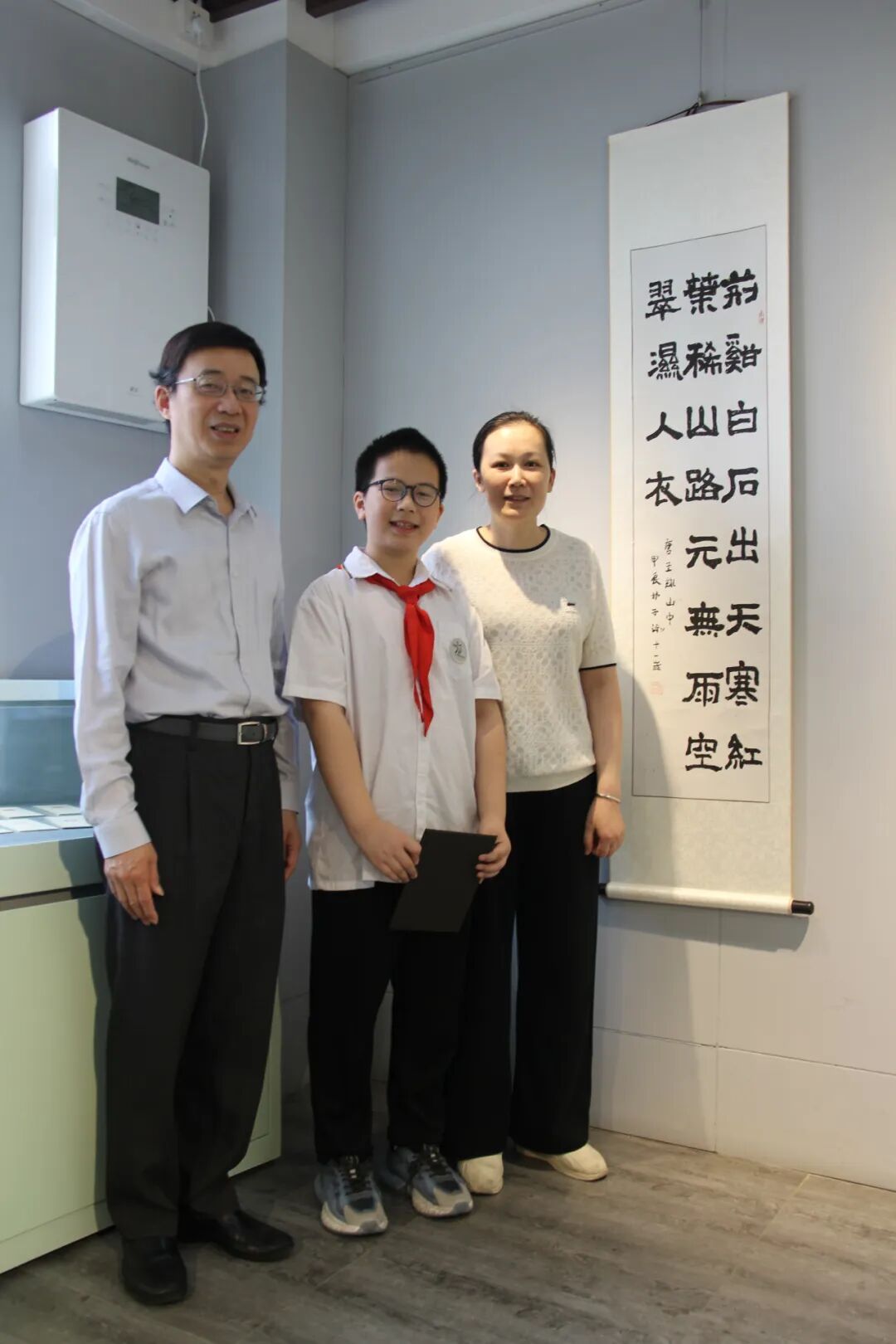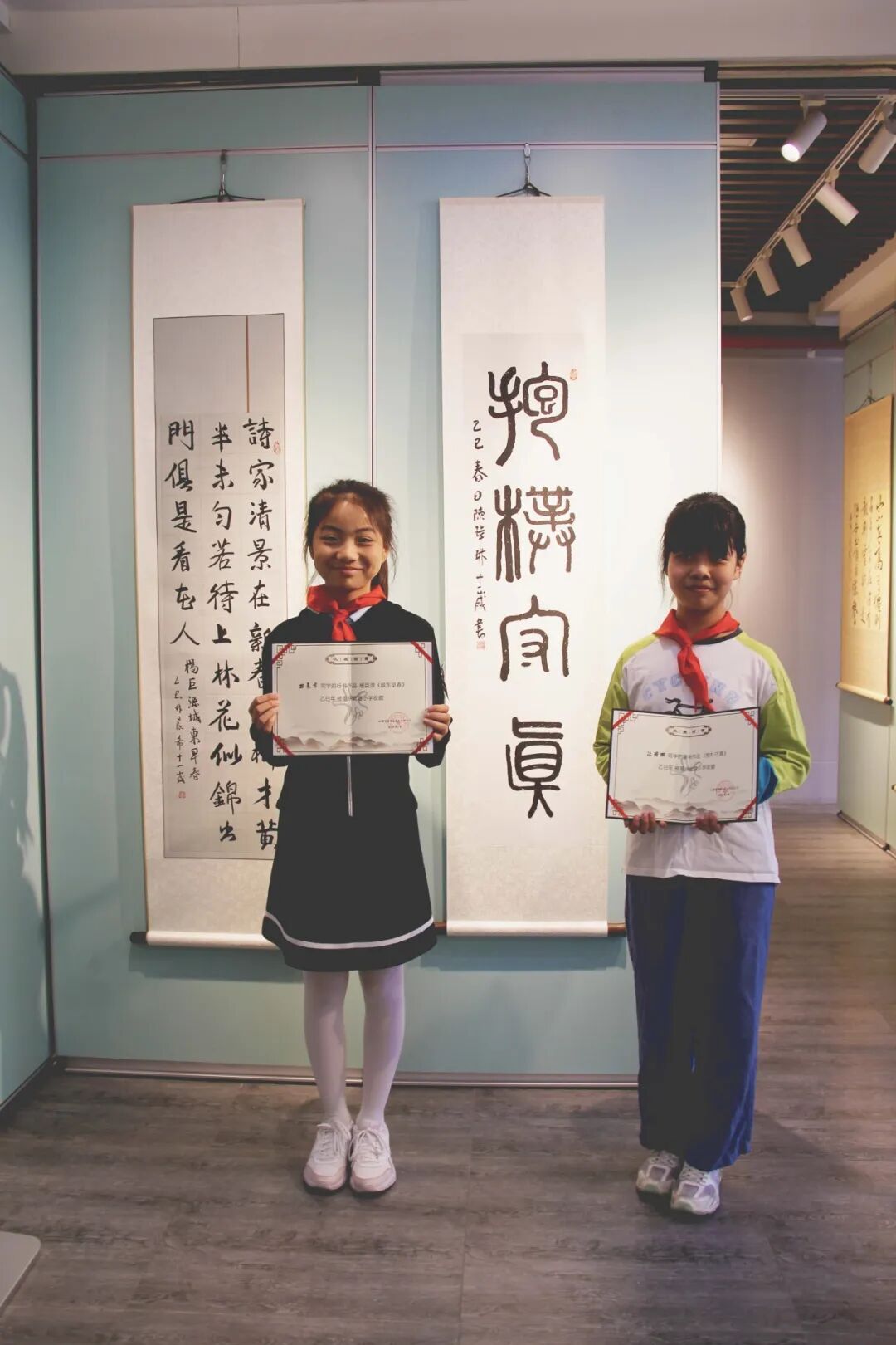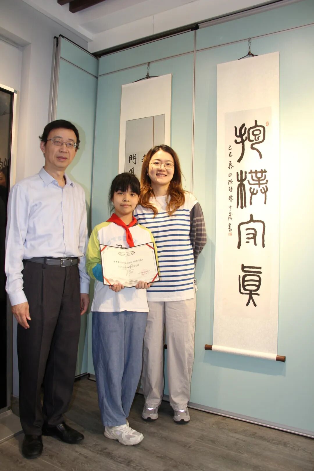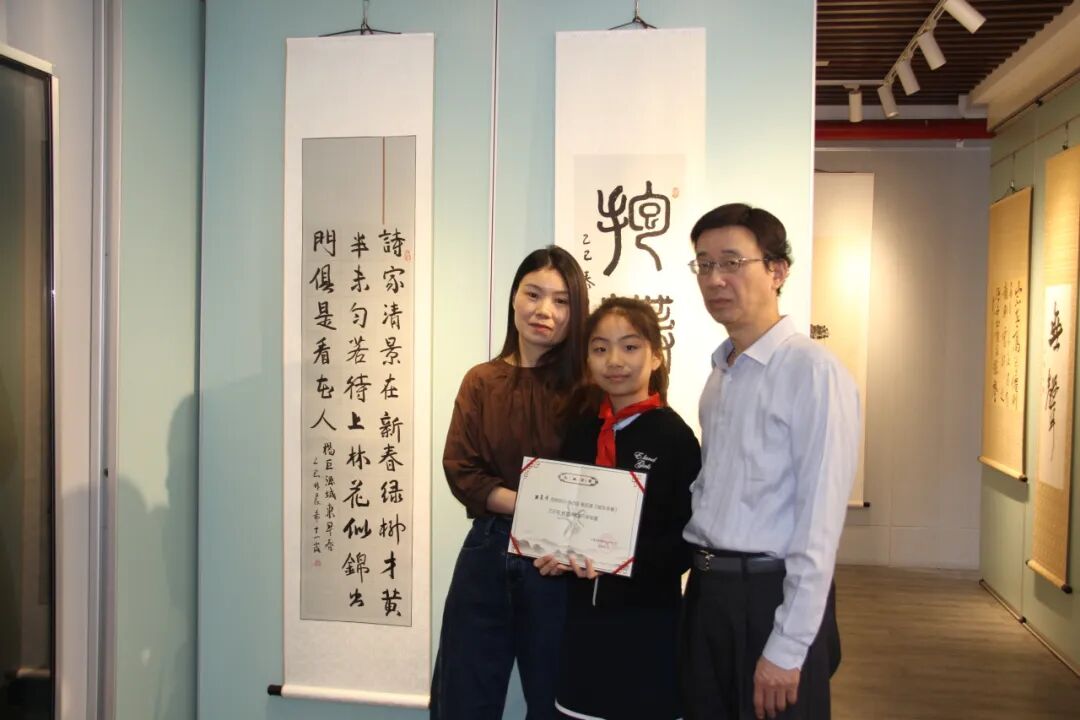 邸之初的篆书·杜甫《江汉》、林子添的隶书·《且将岁月赠山河》、陈玮琳的篆书·《抱朴守真》、林晨希的行书·杨巨源《城东早春》。校领导们郑重地为他们颁发了收藏证书,这些作品将会被母校收藏,并在展厅内展出。
